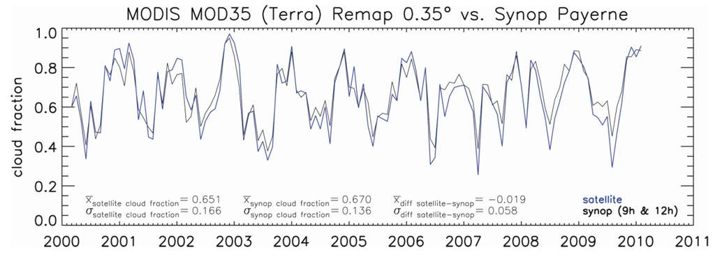 Finally, the high resolution daytime monthly mean cloud fraction data based on the MODIS MOD35 cloud mask product were compared with monthly means of ground-based cloud observations (Synop) from Payerne. The monthly Synop Payerne timeseries are based on synoptic observations made every three hours by a local observer and given in octas (0 octas = clear sky, 8 octas = fully covered sky; 9 = fog, treated as 8 octas in this study). As the MODIS (Terra) overpass time varies between 9:00 and 12:00 UTC, the average of the 9 h synop monthly mean cloud fraction and the 12 h synop monthly mean cloud fraction was used as synop comparison data. For the comparison of cloud cover from ground-based synop observations and satellite-based measurements, previous studies have indicated an optimal area of about 30 km radius [25]. Therefore, the 7 × 7 pixel (i.e., 0.35° × 0.35°) box average centered at Payerne was calculated from the MODIS daytime monthly mean cloud fraction data which corresponds to an area of about 25 km × 35 km at this geographical latitude. Figure 3 shows the intercomparison of MODIS Terra (7 × 7 box average) and Synop Payerne for the period March 2000 to February 2010.