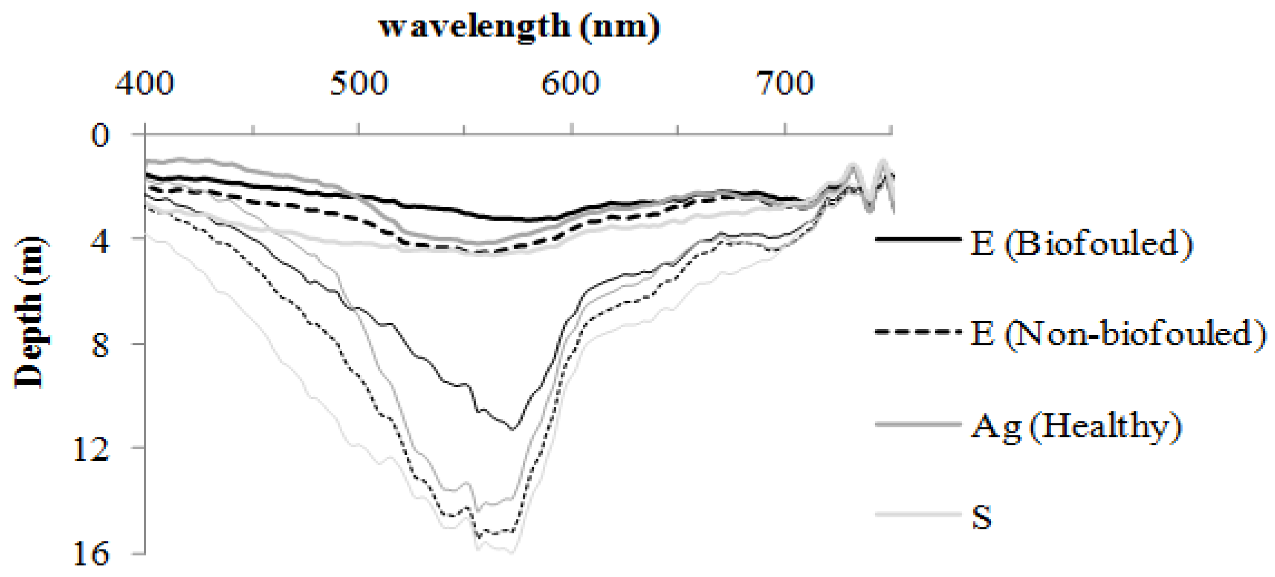 In the case of the in situ spectral data, was defined as the wavelength-dependent standard deviation of a homogeneous in situ reflectance measurement of optically deep water. In the case of imagery, it was defined as the wavelength-dependent standard deviation of reflectance within a homogeneous 33 × 33 pixel optically deep water region [59,60]. The detectability depth limit of each substrate was computed by solving for z in Equation (6):