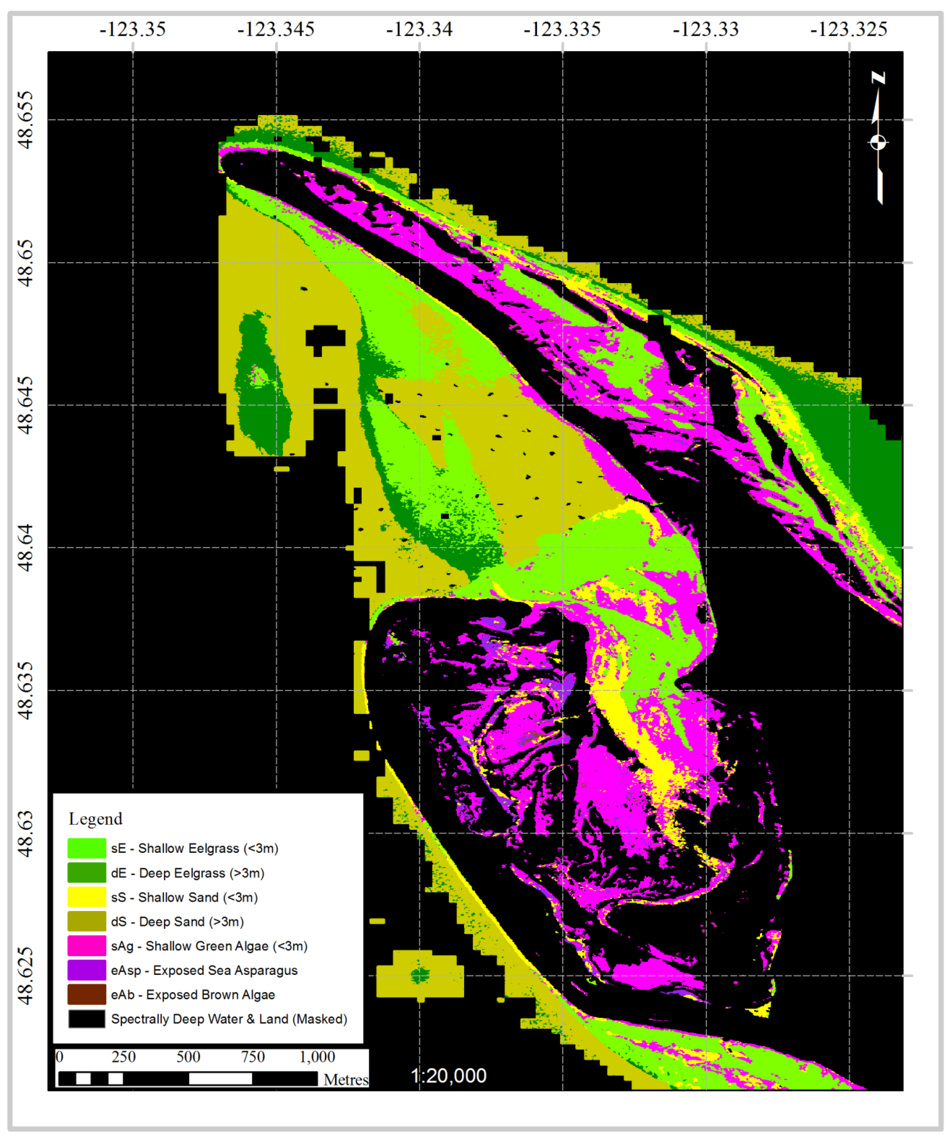 - O’Neill, J.D. Mapping of Eelgrass (Zostera marina) at Sidney Spit, Gulf Islands National Park Reserve of Canada, Using High Spatial Resolution Remote Imagery. M.Sc. Thesis, University of Victoria, Victoria, BC, Canada, 2010. [Google Scholar]