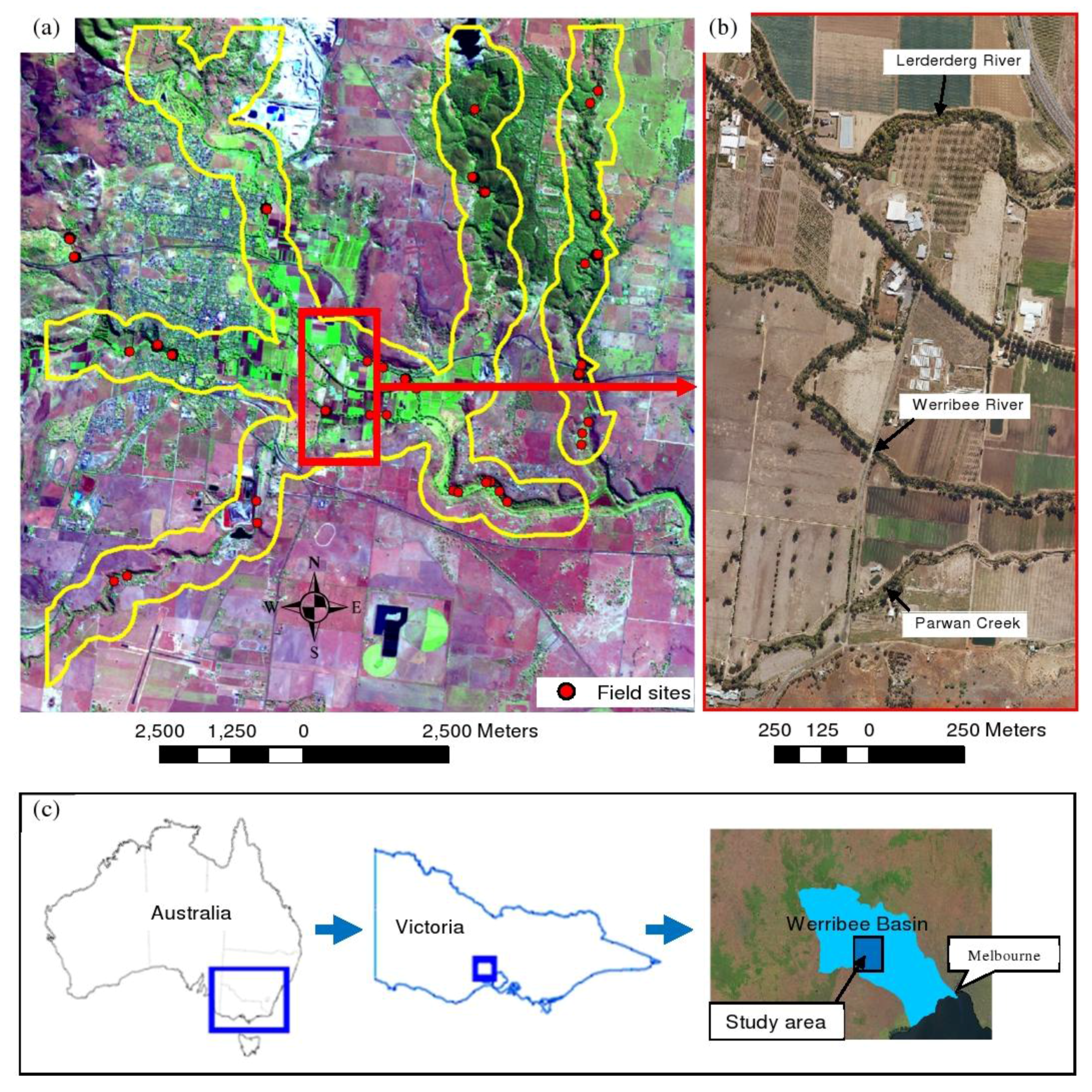 (a) Area covered by the LiDAR data (outlined in yellow) in the Werribee Catchment; (b) zoomed in section of UltracamD image data showing more details of the Lerderderg River (north), Werribee River (middle), and Parwin Creek (south) and (c) study area location within the Werribee Basin, Victoria, Australia. Thirty-five field plots were assessed. A SPOT-5 image is used as a backdrop to illustrate the LiDAR data coverage.