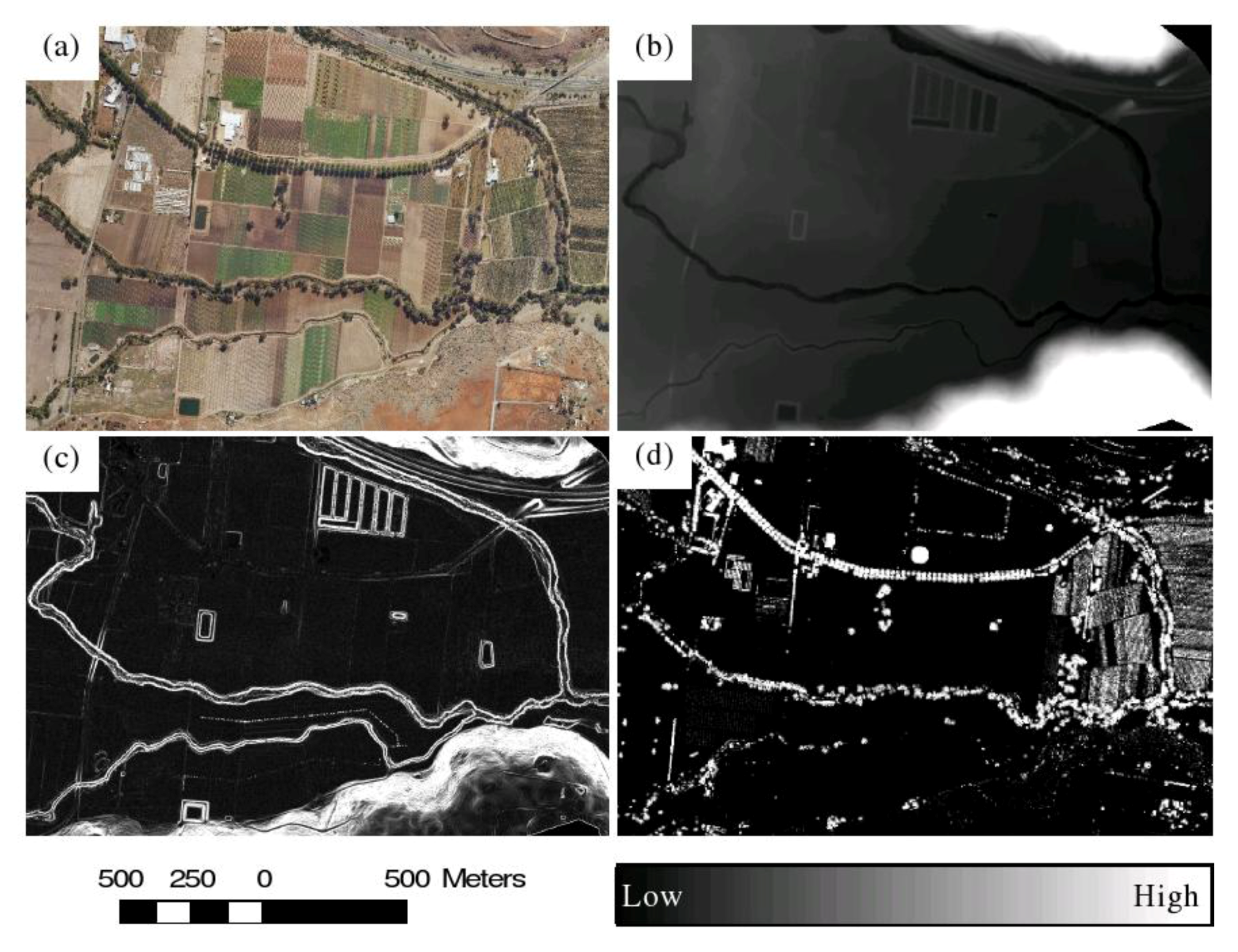 Several papers have concluded that the use of remotely sensed image data is required for the assessment of riparian zones for areas >200 km of stream length, as field surveys become cost prohibitive at those spatial scales [5]. The availability of data from high spatial resolution sensors such as the IKONOS, QuickBird and GeoEye-1 satellite sensors and airborne multi-spectral, hyper-spectral and light detection and ranging (LiDAR) sensors have opened up new opportunities for development of operational mapping and monitoring of small features such as narrow riparian zones [6,7]. Johansen et al. [8,9] found airborne LiDAR data to be suitable for mapping a number of riparian environmental indicators. They also assessed the use of LiDAR data for mapping streambed and riparian zone extents using geographic object based image analysis (GEOBIA) and obtained high mapping accuracies of streambed and riparian zone widths [8]. However, the rule sets applied to automatically map streambed and riparian zone extents were found time-consuming, especially for large area mapping because of the use of near pixel-level segmentations and region growing algorithms. The rule sets were also found to work only in areas with streambeds clearly defined by bordering steep bank slopes.