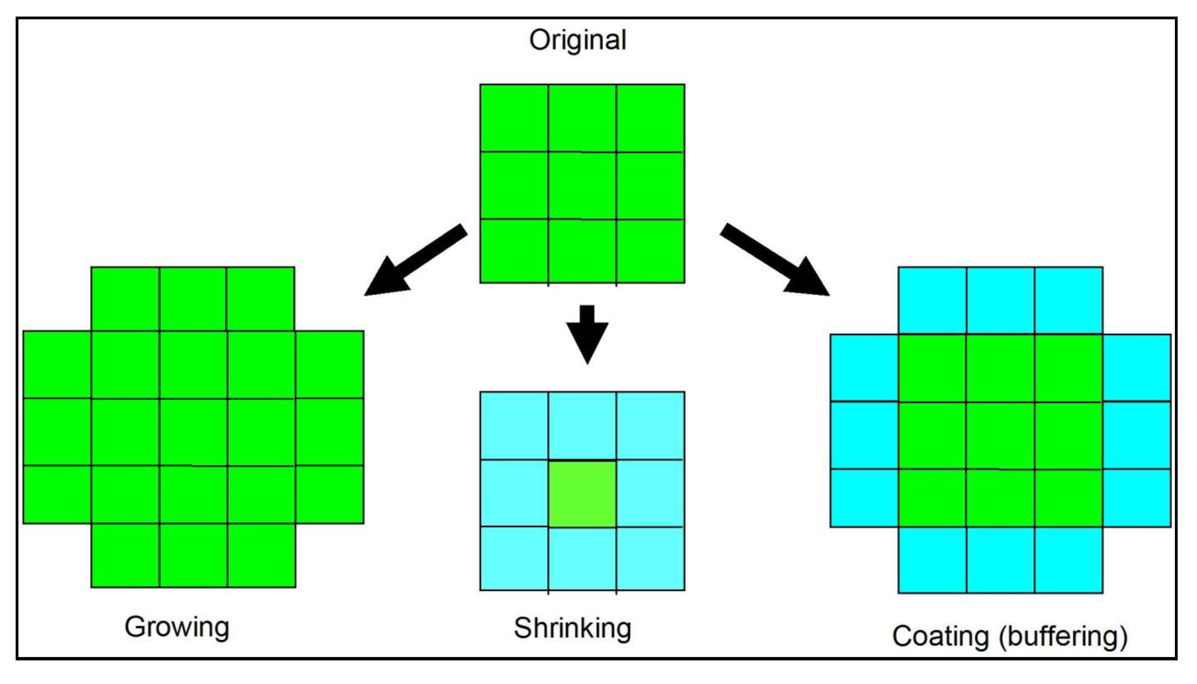 Pixel-based object resizing algorithms are new algorithms introduced in eCognition 8, which allow the growing, shrinking and coating of objects by directly connecting to single pixels of the underlying data sets. The growing mode adds and merges one row of pixels on the outside of an existing object. Through multiple loops, multiple layers of pixels can be added. The shrinking mode subtracts one row of pixels from an original object through classification of this row of objects as a separate class. The coating mode adjoins one row of pixels around an existing object and classifies it to a separate class, similar to buffering (Figure 3) [40]. Conditions can be set for adding, subtracting and adjoining layers of pixels, e.g., only pixels below a set threshold may be considered. Through looping, multiple layers of pixels can be added, subtracted or adjoined. These algorithms may replace some computational intensive object growing algorithms, which rely heavily on topological calculations between objects (polygons).
