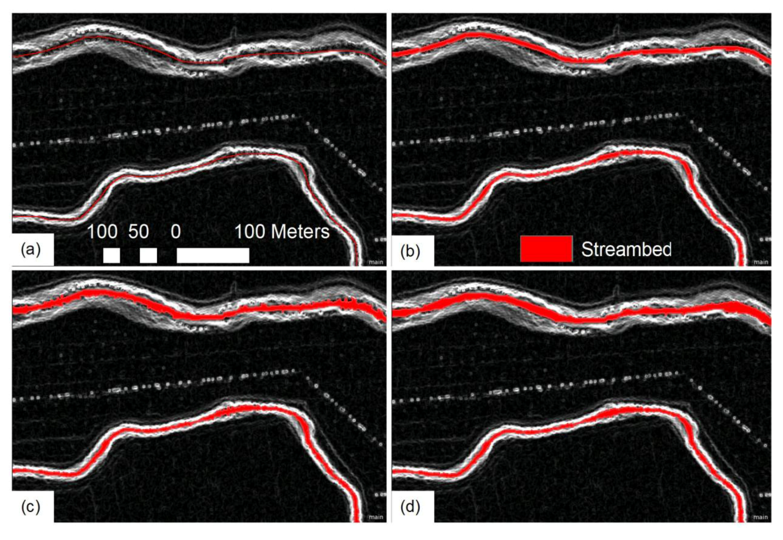 Mapping the streambed from the LiDAR derived DTM and slope layers and a rasterized polyline representing the stream centerline. The slope layer is used as a backdrop. (a) Classification of stream centerline using multi-threshold segmentation; (b) Pixel-based object growing of centerline; (c) Further pixel-based object growing based on the DTM and slope; (d) Final extent of streambed after merging.