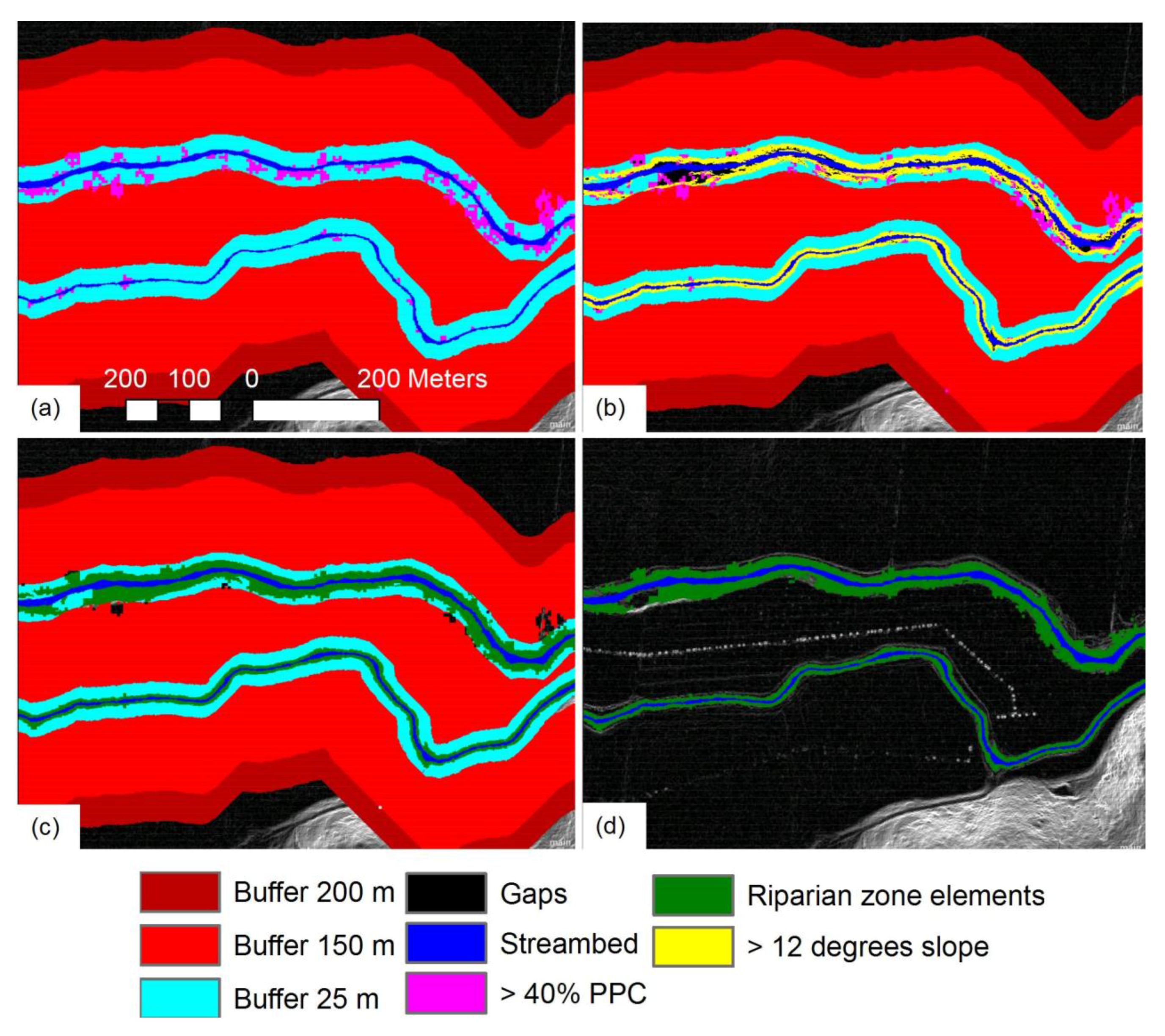 Mapping riparian zone extent from the LiDAR derived DTM, slope, PPC and streambed layers. The slope layer is used as a backdrop. (a) Buffers and mapping of streamside woody vegetation with more than 40% plant projective cover; (b) Mapping of stream banks based on slope; (c) Mapping of riparian zone extent adjusted based on elevation in relation to the streambed; (d) Adjusting riparian zone edges based on PPC.