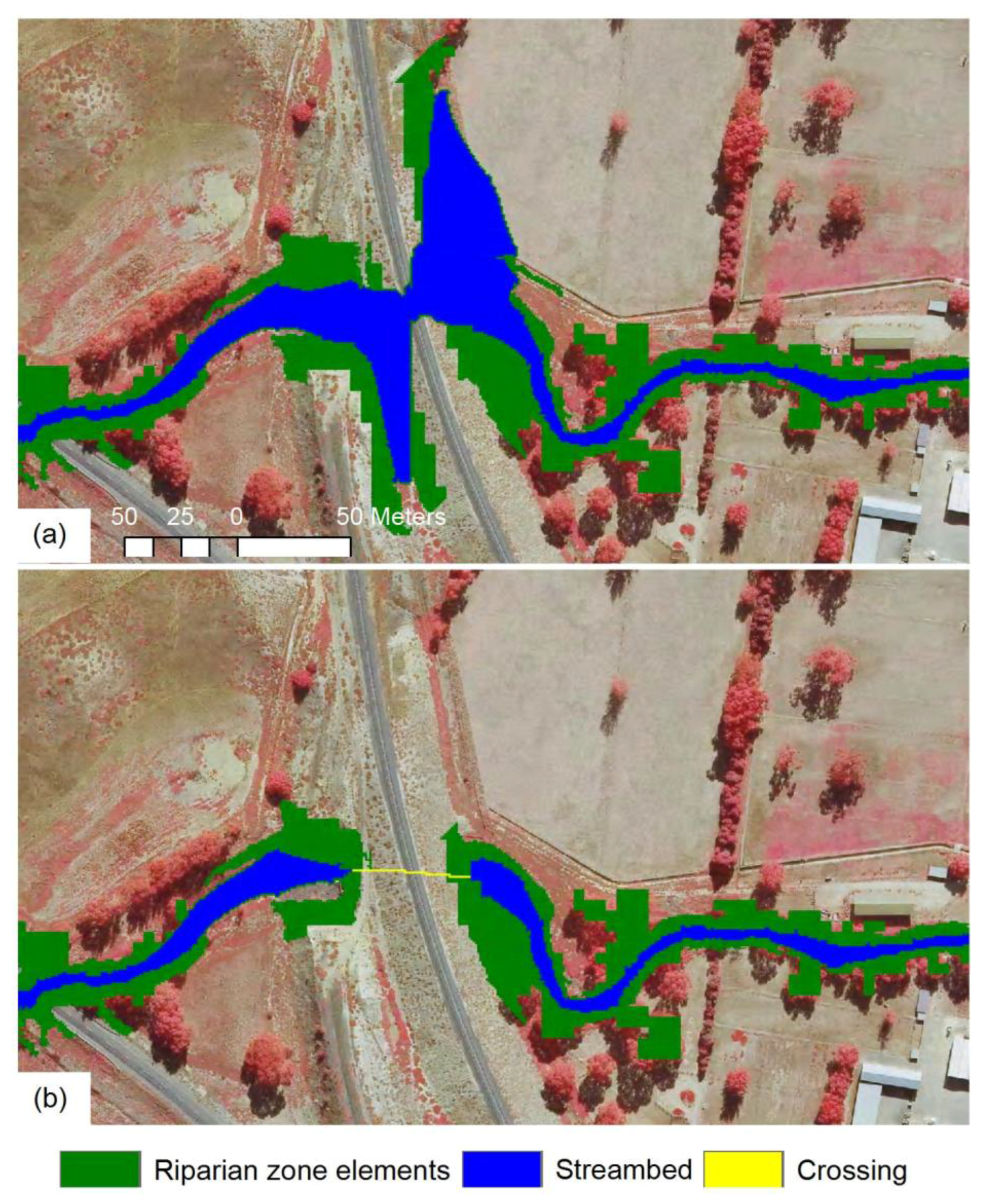 Example of streambed and riparian zone classification for an area with a railway crossing the stream. (a) Classification issues of the stream and riparian zone because of distinct elevation and slope changes caused by the railway crossing; (b) Improved classification where the railway crossing has been classified based on distinct elevation differences.