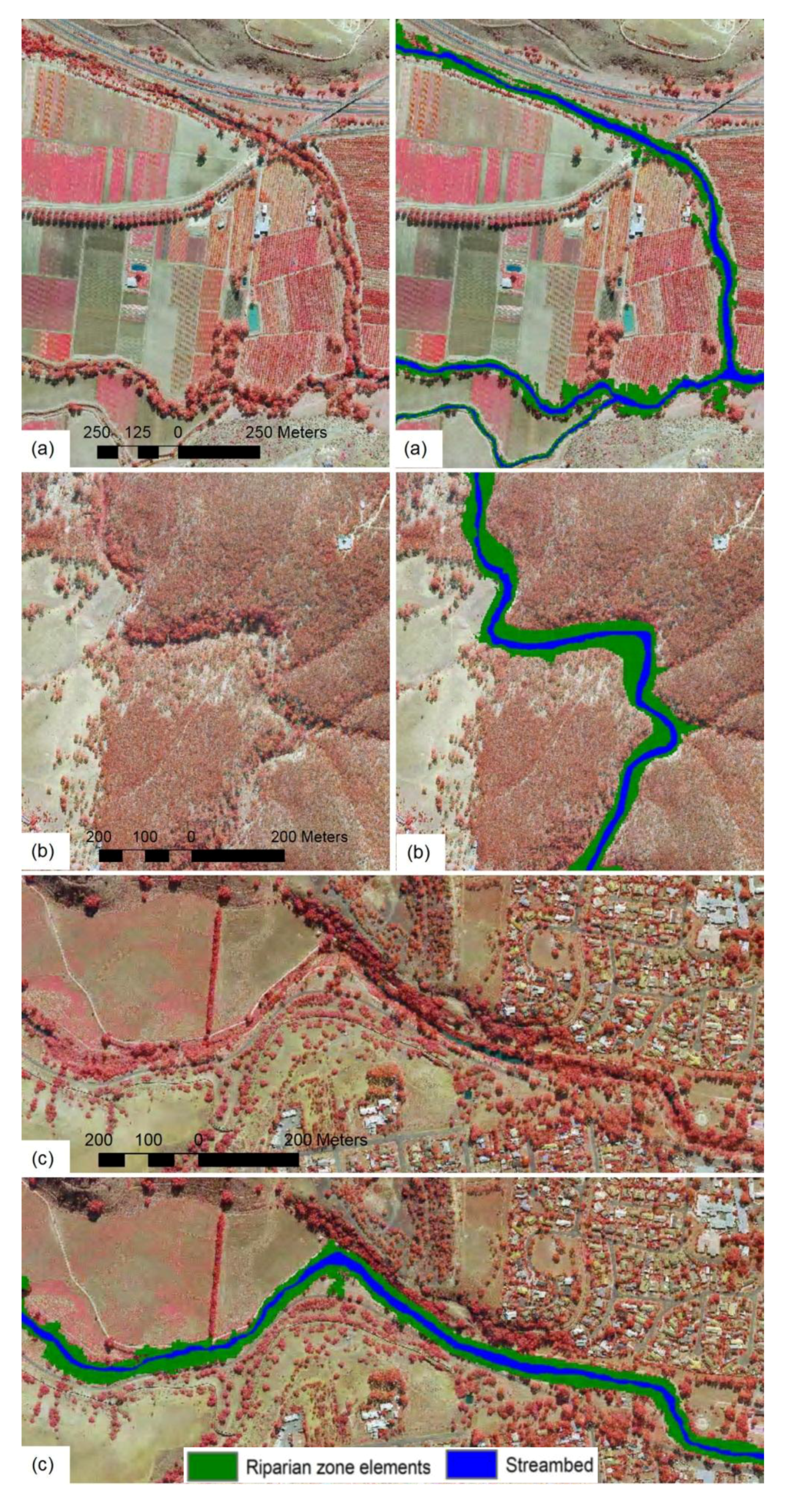 Mapping results showing streambed and riparian zone extent with UltracamD image data used as a backdrop for an (a) agricultural; (b) forested; and (c) urbanized area depicted both without and with the classification result.
