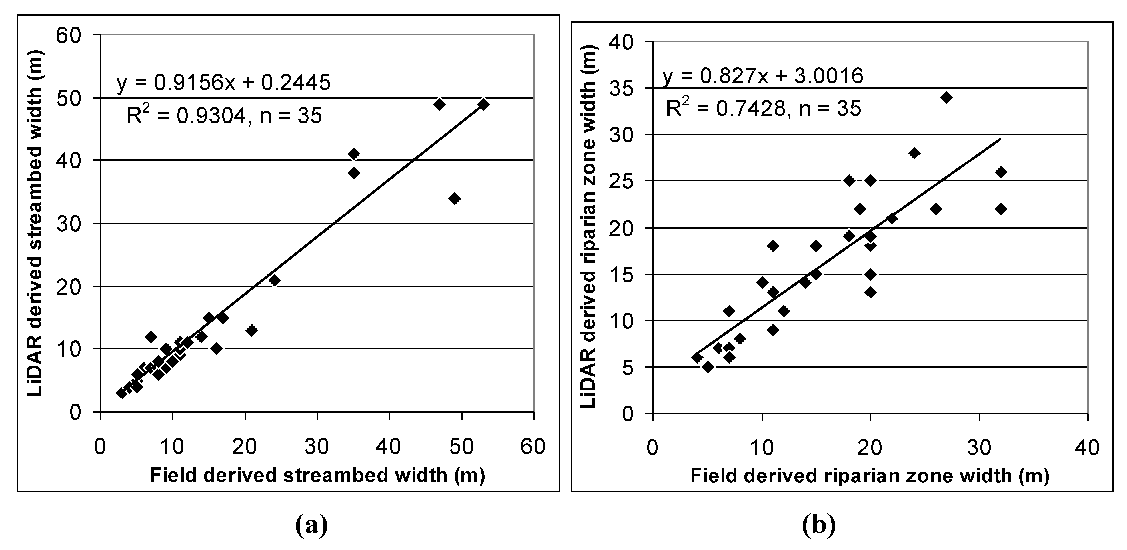 Scatter plots and trend lines comparing field and LiDAR derived (a) streambed width and (b) riparian zone width for 35 field sites. (a) RMSE = 3.6 m, P < 0.001; (b) RMSE = 3.9 m, P < 0.001.