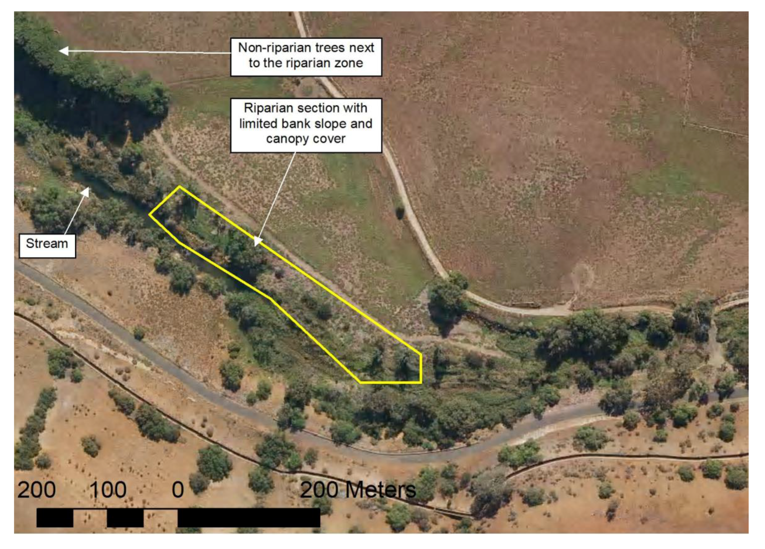 Example of riparian zone section (outlined in yellow) with very limited bank slope and canopy cover, which caused underestimation of riparian zone width in some areas. Non-riparian trees next to the riparian zone caused overestimation of riparian zone width. UltracamD image data used for illustration.