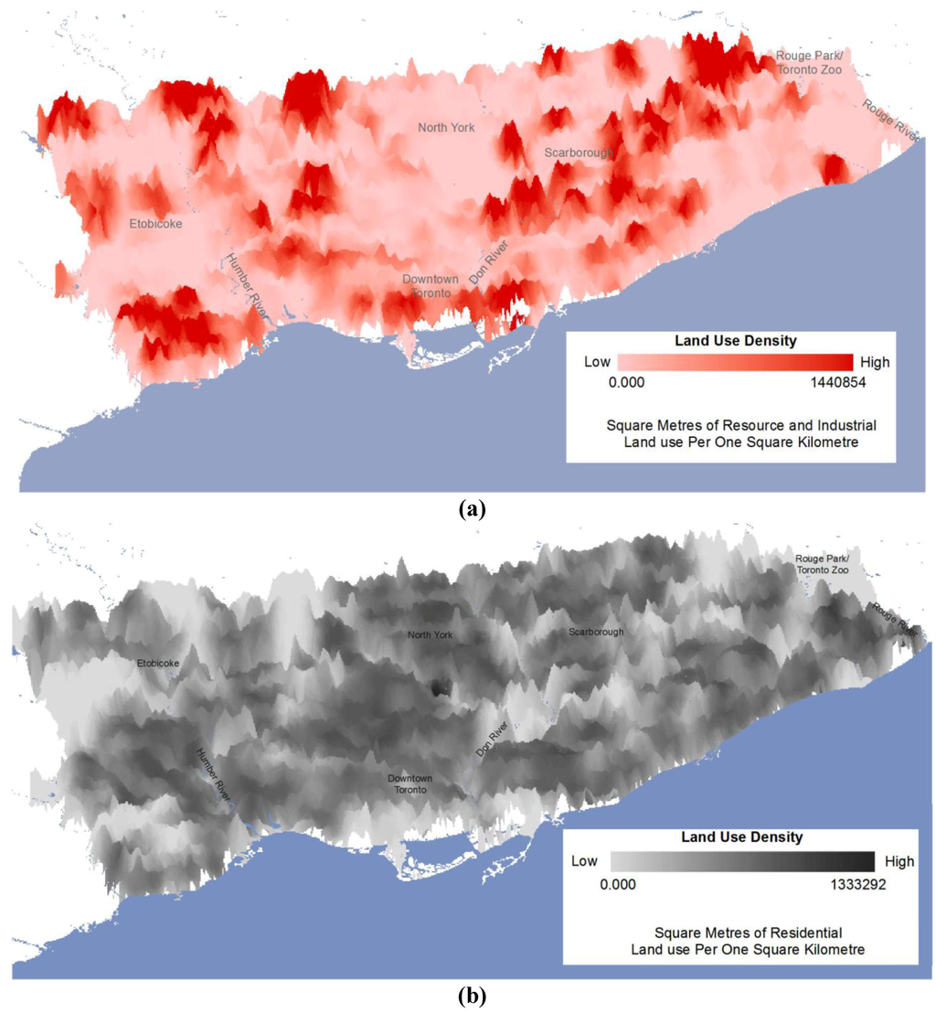 Figure 4 shows examples of three land use density surfaces overlaid on a three-dimensional temperature map. High densities of resource/industrial land use frequently coincide with peaks of high temperature (Figure 4(a)). These clusters are found in north and south Etobicoke, northwest North York, the Toronto Harbour area in the south-centre of Toronto, and in a band from east Toronto to northeast Scarborough. In contrast, residential land use density does not systematically coincide with higher or lower temperatures upon visual inspection (Figure 4(b)). Finally, high densities of parks/recreation tend to co-locate with temperature “valleys” in Toronto’s ravines and green spaces (e.g., Humber Valley Golf Course, Rouge Park/Toronto Zoo; Humber, Don, and Rouge rivers (Figure 4(c)).