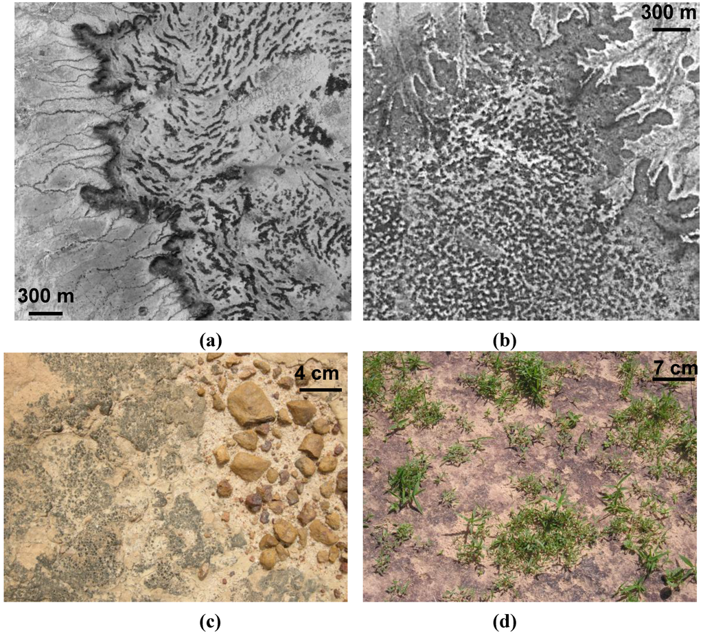 Tiger bush (Brousse tigrée) plateau in Banizoumbou (a), Gapped bush plateau in Tamou (b), view of biological crusts on lateritic soil of plateaux (c), view of biological crusts on sandy soil of valley (d). In (a) and (b), vegetation appears in dark while lighter pixels represent bare soil (optical images).