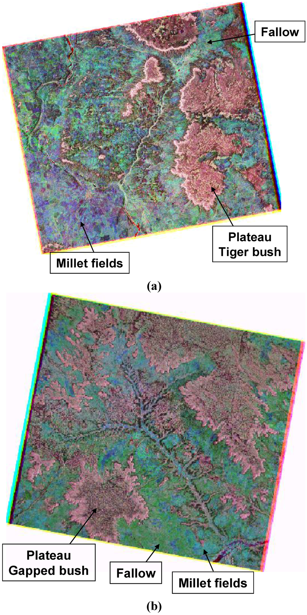 (1) Plateaus formed by Tertiary fluvio-lacustrine deposits, capped by a thick laterite cuirass with slight slopes of a maximum of one percent. They are dissected into several sections by erosion and covered with tiger bush (brousse tigrée) or gapped bush (brousse tachetée), depending on the distribution of bare soil and small trees that formed the bush [26]. The bush corresponds to tiger bush (Figure 2(a)) when the bare soil and trees form long arcs or bands. The tiger bush pattern consists of alternating lines of small trees about 4 m high and strips of bare or sparsely vegetated ground [27,28] (Figure 2(a)). The distance between successive vegetated bands varies between 60 and 120 m. When the vegetation is not structured in gaps rather than bands, the bush is called gapped (Figure 2(b)). The mean distance between two consecutive gaps is about 50 m for gapped bush. The bare soil of plateaus is characterized by an important crusting due to strong precipitations in the rainy season which run off the surface. Water infiltrates the vegetated bands and thus plays an important role in the maintenance of these vegetated areas [29]. Three main classes are identified on plateau: bare soil (with gravel), sparse vegetation, and dense vegetation.