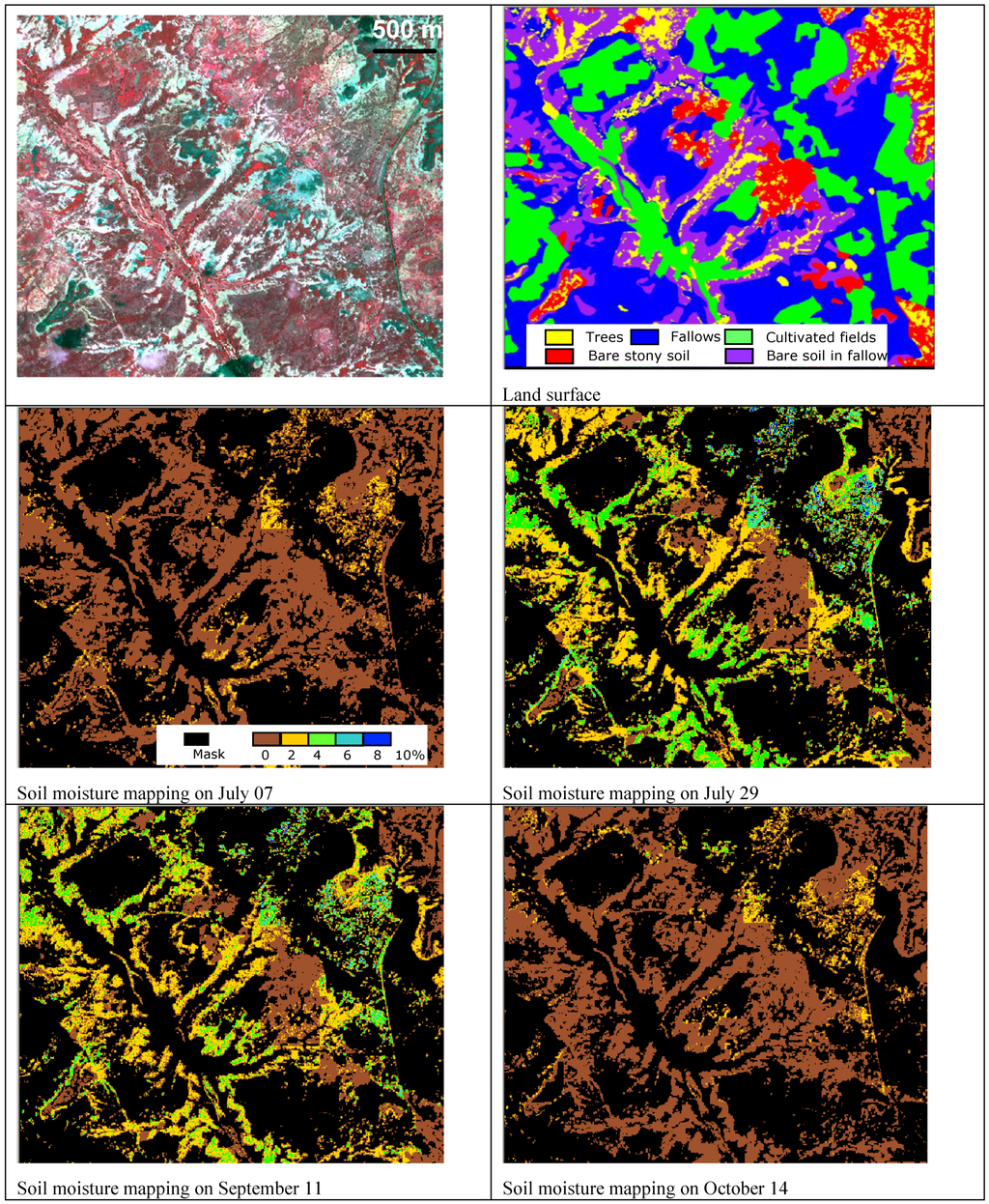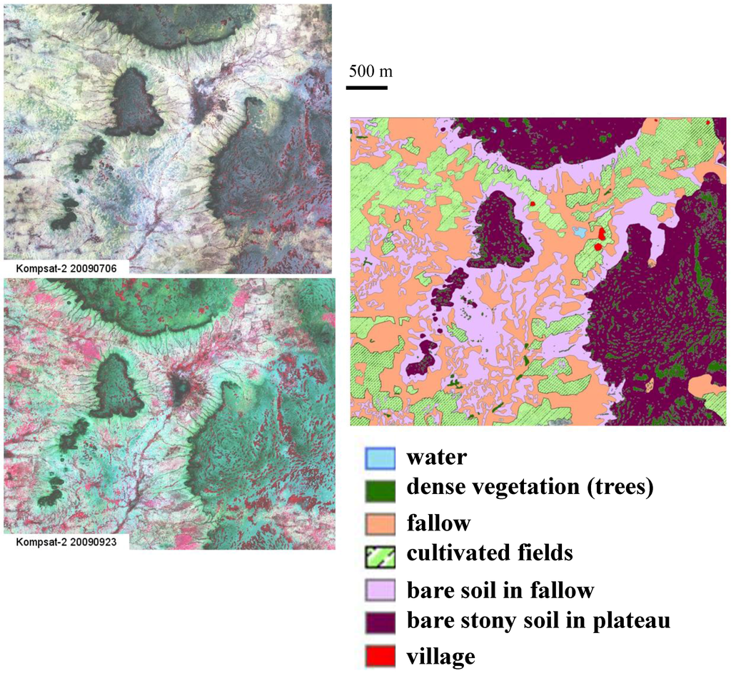 Very high spatial resolution optical images were also collected on Banizoumbou (July and September 2009) and Tamou (June, August, September and November 2009) from Kompsat-2 sensor (http://www.kari.re.kr/eng/). Images have spatial resolutions of 1 m in panchromatic mode and 4 m in multispectral mode (blue, green, red, infrared). These images were used to allow a reliable mapping of land surface types: water, forest thickets (fourré), fallow, cultivated fields, bare soil mainly in fallow, bare stony soil mainly on plateau, and village (Figure 4). The class “forest thicket” mainly represents the vegetation situated on plateaus. The detailed land use maps were produced by Computer Assisted Photo-Interpretation (CAPI). The analysis of diachronic images between dry and rainy seasons was particularly useful for differentiating land use, especially bare soil and cultivated areas. CAPI was preferred to other classification techniques because the information contained in the Kompsat imagery was used to its maximum.