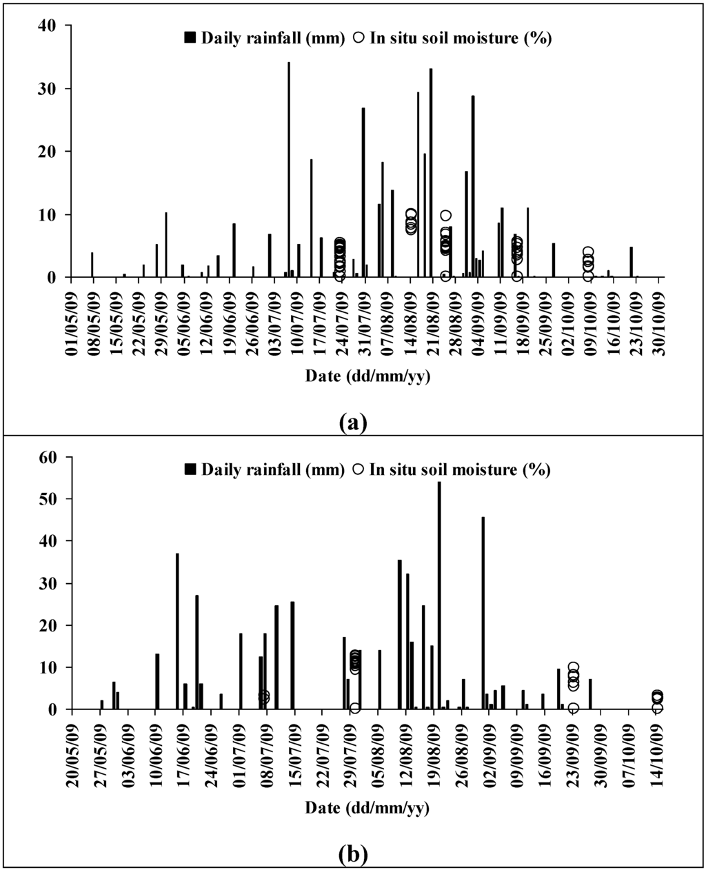 Meteorological data recorded close to the study site and in situ soil moisture content for our training areas: Banizoumbou (a) and Tamou (b).