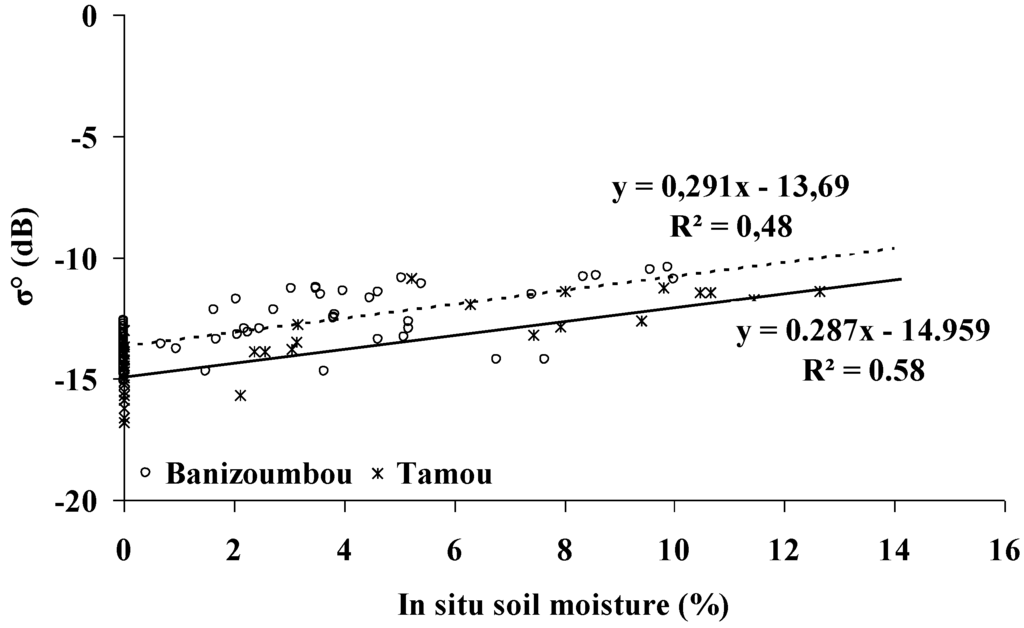 Sensitivity of TerraSAR-X signal to surface soil moisture for each study site (27° for Banizoumbou and 39° for Tamou). Each point corresponds to the average backscattering coefficient in decibels of pixels around in situ measurements of soil moisture.