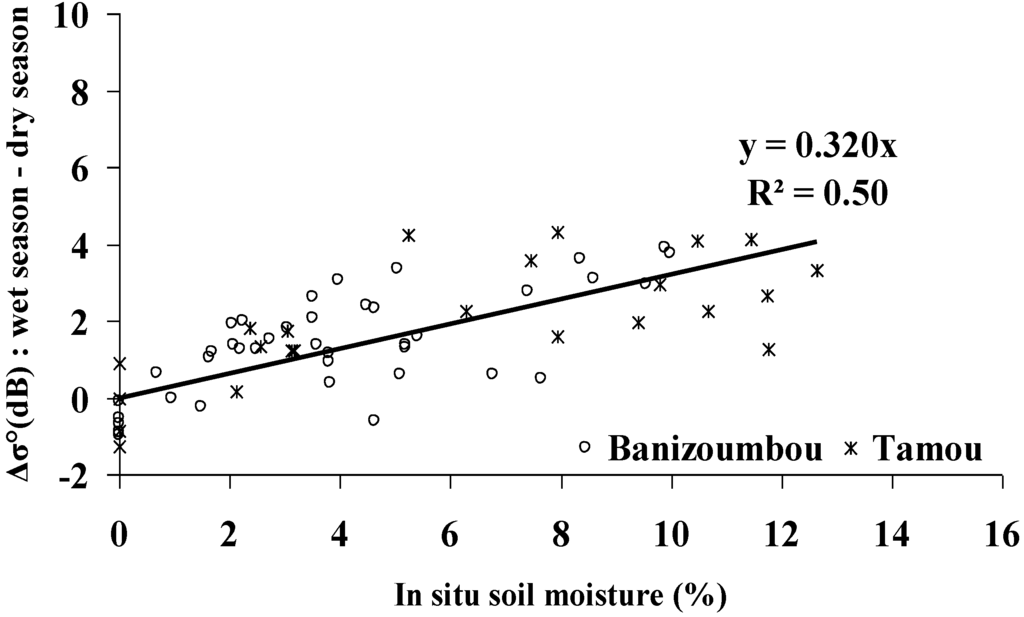 The coefficients a and d of Equation (3) were then calculated as a function of incidence angle, regardless of soil roughness. Figure 6 shows the linear relationships between radar signal and soil moisture for each study site. An offset of about 1.3 dB between the two relationships shows the effect of radar incidence angle, with higher σ° for Banizoumbou images than for Tamou images (27° for Banizoumbou and 39° for Tamou). Results show that the sensitivity of the radar signal to soil moisture is of the same order for 27° and 39° (0.292 dB/% for 27° and 0.287dB/% for 39°. These results therefore show that moisture mapping is optimal at low and medium incidence angles. In the case where two TerraSAR images with the same incidence angle were used, one in dry season and one in rainy season (Equation (4)), the sensitivity of the difference Δσ° (dB) to soil moisture is about 0.32 dB/% (Figure 7).