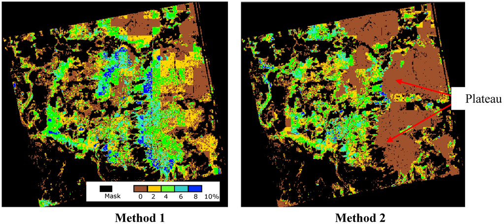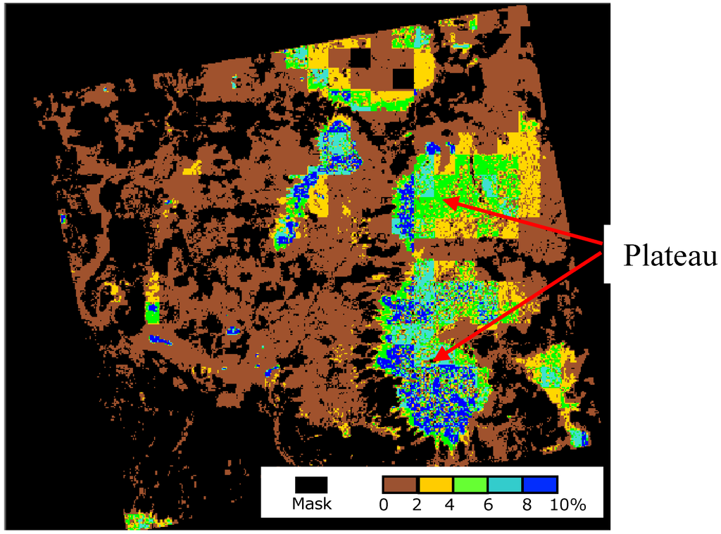The in situ soil moisture in each cell and for each land surface class is assumed to be equal to the mean value of all moisture measurements present in each cell. Validation of the soil moisture retrieval algorithm was carried out in comparing in situ data and estimations derived from TerraSAR-X using the inversion model (Equations (3) and (4)). The use of a single TerraSAR image (method 1) overestimates the moisture content on plateaus of about 6.3% (with RMSE = 6.6%). This overestimation of soil moisture on plateaus is due to a stronger soil roughness (cuirass) whereas the soil of fallows is relatively smoother (sandy). Moreover, the limit between low lands and plateaus also appears very wet, that is in relation to important slopes at these areas. Figure 8 shows the soil moisture map on 29 May (dry season) over Banizoumbou. At this date, the estimated soil moisture is almost null on the whole of the site, except on the plateaus where strong erroneous values are observed (reach 8%).