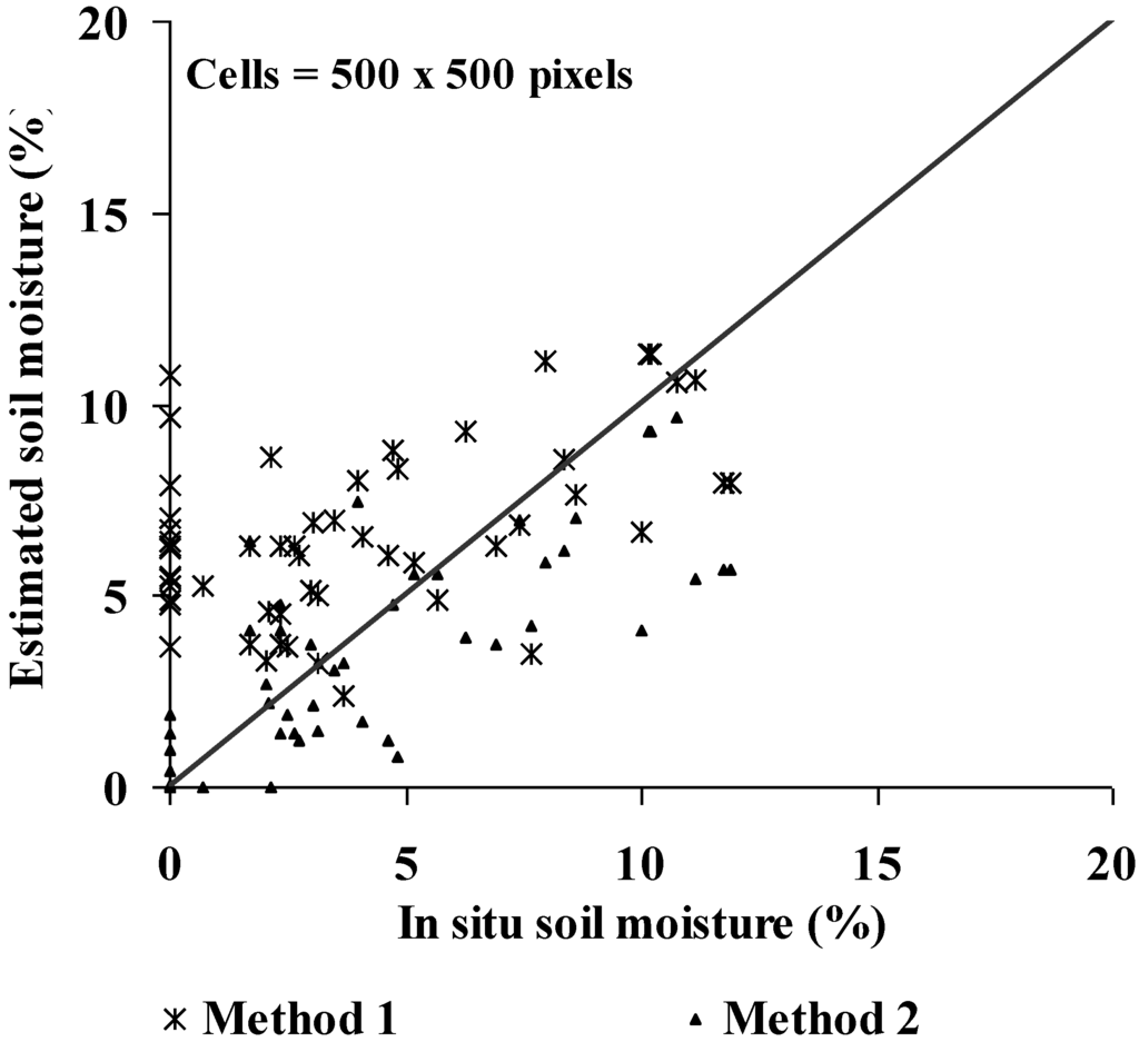 The mapping of soil moisture is much more coherent by using the difference between two images, one acquired in the dry season (29 May for Banizoumbou and 4 June for Tamou) and one in the rainy season (method 2), since this difference eliminates the surface roughness effect. Figure 9 shows on the estimated soil moisture map of 25 August (Banizoumbou) low soil moisture values on plateaus in using method 2. Indeed, the estimated moisture on plateaus is close to 0 with method 2, which is closer to the ground observations. Finally, the analysis of soil moisture temporal evolution during the year, on Tamou for example (Figure 10), shows that moisture content remains stable on the plateaus (0–2% over the whole year) and it changes in low lands. Figure 11 and Table 3 show the comparison between estimated and measured soil moistures. Method 1 overestimates the soil while method 2 provides better results. The in situ moistures null correspond to strong values of estimated moistures (up to 11%) with the method 1 which neglects the effect of roughness. That relates mainly to samples located on the plateaus. With the method 2, these moistures are estimated at values close to 0. The mean difference between estimated and measured soil moisture is lower than 1% with method 2 and about 3% with method 1. The resulting RMSE is about 2% with method 2 and 4% with method 1.