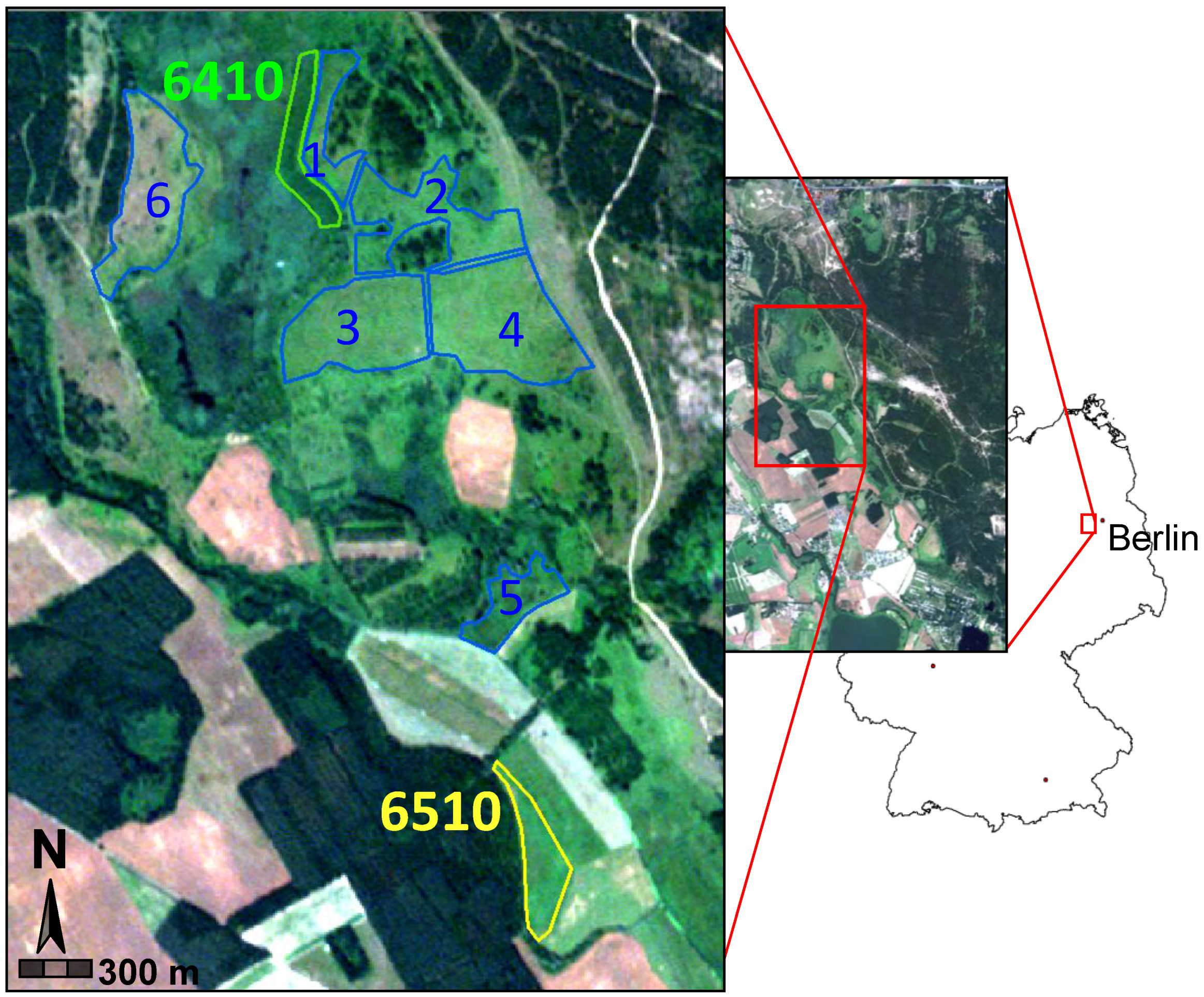 The research area Döberitzer Heide is a protected nature reserve west of Berlin. It is one of the former military areas of north-eastern Germany that have been converted to protected nature reserves with large open landscape sections. Today, the nature reserve Döberitzer Heide consists of a rich semi-natural landscape mosaic. Stretching over 60 km2 from 52.54°N/12.98°E (UL) to 52.46°N/13.10°E (LR), it includes wood, dry sandy heaths, semi-natural grasslands, humid meadows and wetlands in flat terrain, some of which are not accessible due to remnants of military munitions. In particular, the semi-natural grassland and humid meadows section comprises some species-rich and highly endangered NATURA 2000 habitats.