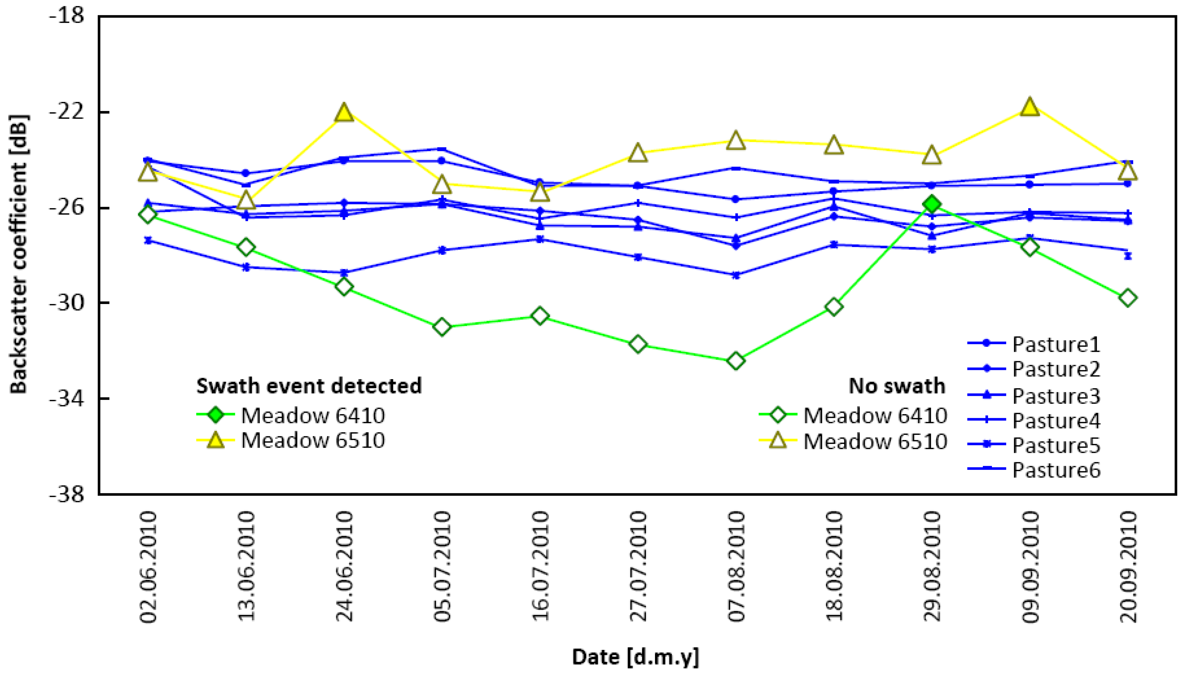 The temporal backscatter profiles for the mean backscatter coefficient (σ°) serve as a primary basis for the swath detection analysis (Figure 2). General observations are that: (a) the investigated sites return profiles that show different temporal patterns; (b) the change in temporal increase or decrease is stronger for the meadows 6410 and 6510 as compared to the different pasture sites; (c) distinct oscillations are observed as upward peaks (increase followed by decrease) only, no abruptdecrease-increase movement is returned (compare 6410, 6510); and (d) the Molinia meadow (6410) backscatter is generally lower than in other areas, in particular during the late phenological growth phase of the respective plant associations that appears to reduce the backscatter signal. With respect to meteorological covariates, no direct correlations were found that could interfere with the detection of swath events.