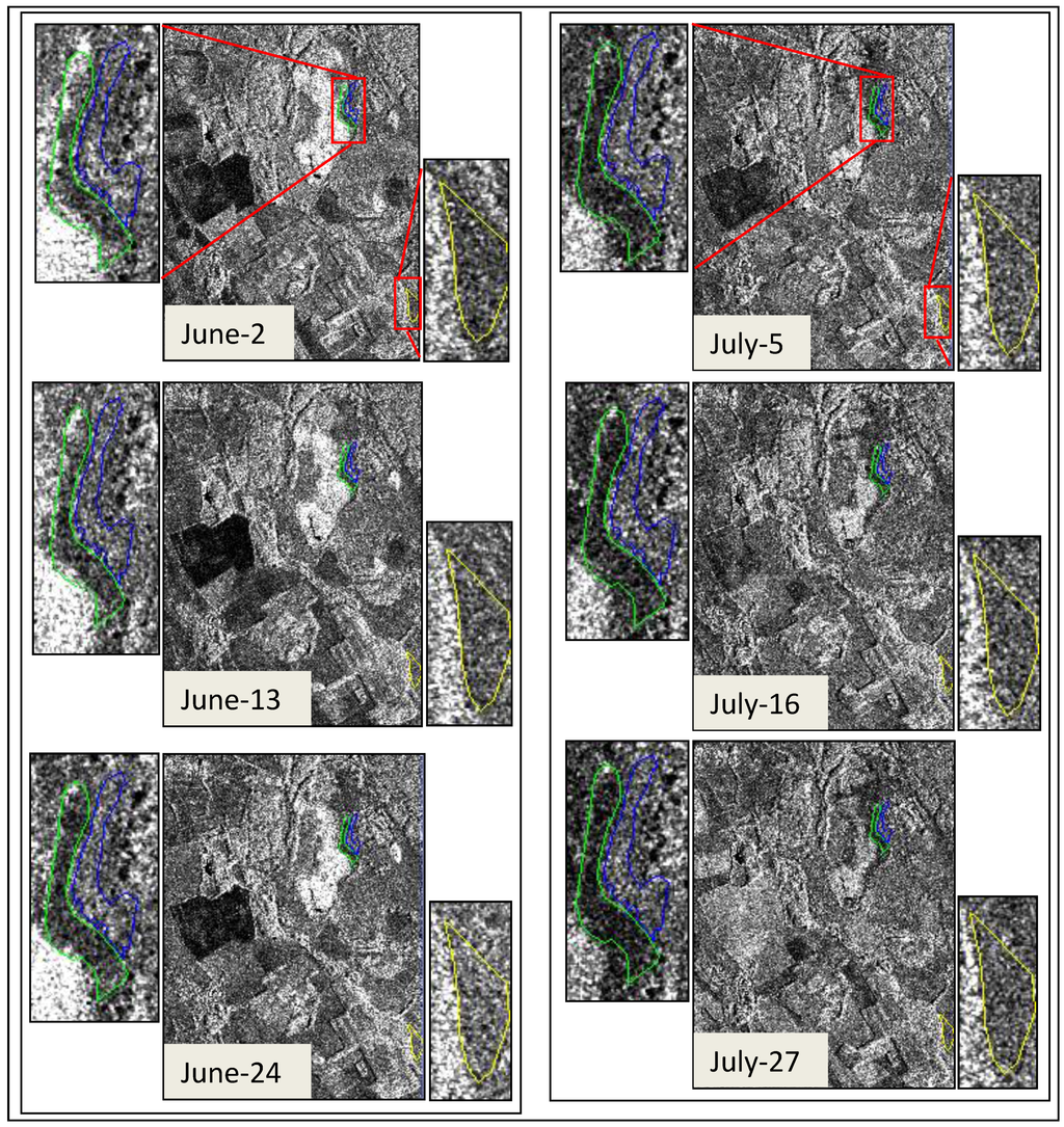Temporal signature profiles were created from σ0 mean values within the reference areas. We performed this analysis on areas, rather than on single pixels because speckle noise effects lead to high standard deviations.