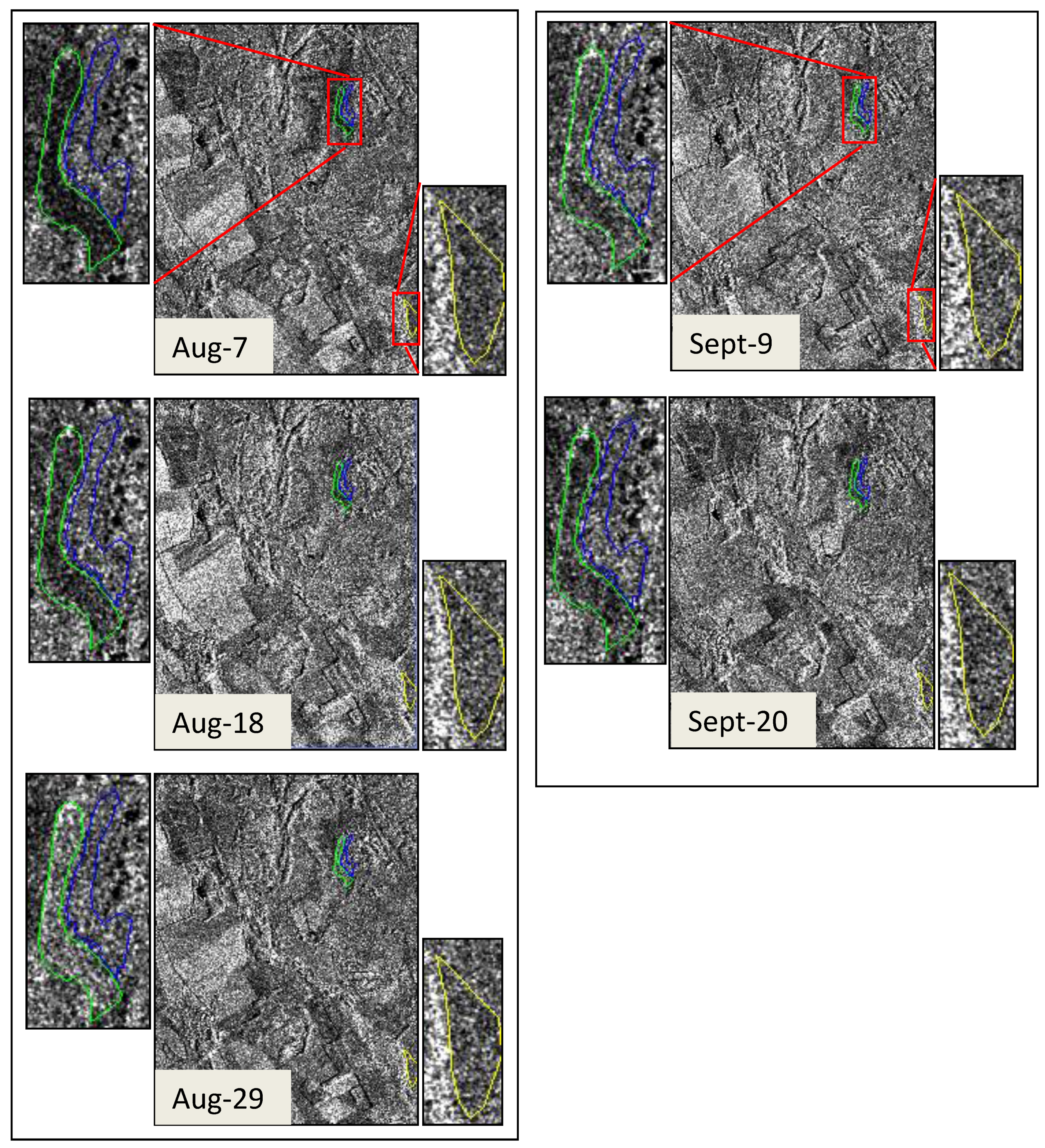 The characteristic swath peaks observed in the temporal backscatter signal profiles are visible from the actual time series images (Figure 3). The image acquired right after the swath always returns a high backscatter increase for the respective site, followed by a strong decrease (compare to Figure 2 and Table 1). In contrast, the pasture site does not return such obvious change for any of the observed dates. Strong changes in the subset scene are especially visible for agricultural fields with bigger and clearly bordered distinctive areas. Representing the traditional object in radar remote sensing of vegetation, their characterization is strongly facilitated not only due to their size, but also as a result of their homogenous texture (composition of plant association) as well as clearly determined and spatially-homogenous human swath impacts (e.g., no grazing). Grazing interferes with steady phenological growth in semi-natural grassland areas and is expected to cause minor shifts in the backscatter profiles. However, grazing activities are difficult to quantify. As the cattle movement in the research area is relatively independent, the ground truth data is not precise enough. In the end, however, cattle movements do not lead to abrupt effects in the backscatter profiles and may therefore be disregarded for the study of swath events.