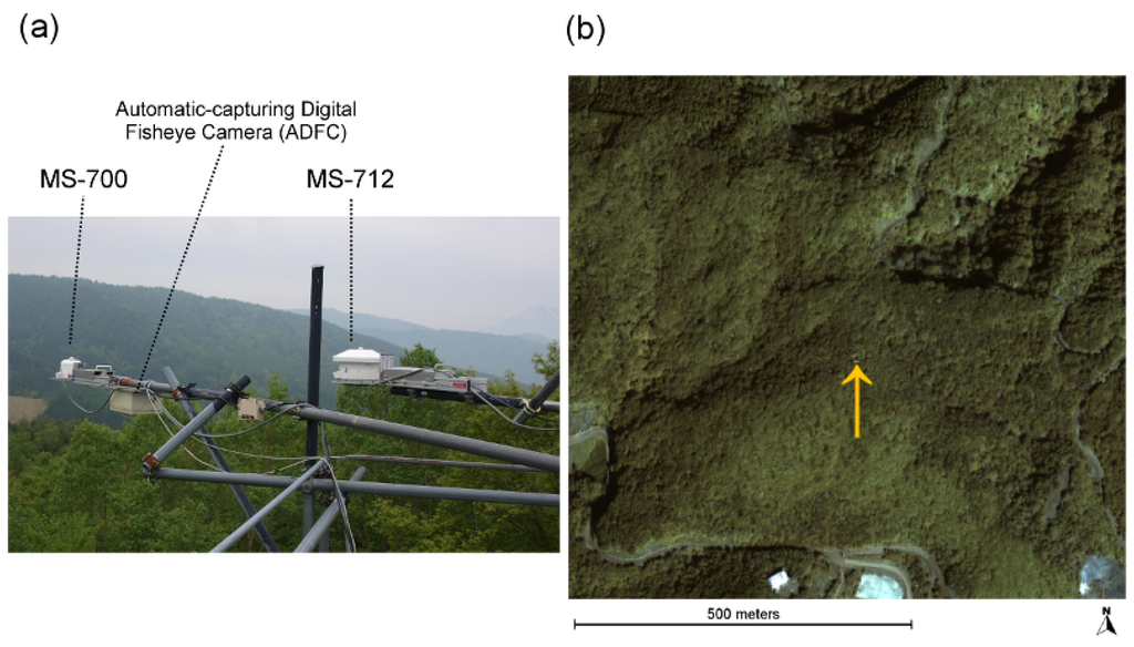The area for a 250 m radius around the canopy-access tower was almost covered with deciduous forest according to the high-resolution satellite image shown in Figure 1(b). Ohtsuka et al. [] reported that the basal area of deciduous broadleaved trees accounted for approximately 95% of the total basal area in a 100 m × 100 m plot adjacent to the northwest of the canopy-access tower. The field view of the HSSRs, which was largely consistent with the area shown in the ADFC photos (the area about a 10 m radius in following figure), also consisted of the same deciduous broadleaved trees.