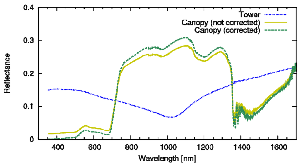 Because the canopy-access tower also comes into the field of view (FOV) of the HSSRs, we corrected the contamination of the tower reflectance. Using the linear mixture model theory [], we assumed that the reflectance measured by the HSSRs (ρHSSR) can be expressed by the following equation:
