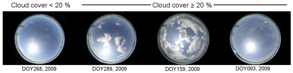 We only used the data with a ‘clear’ cloud state flag for the MOD09/MYD09 products, but several data were still measured under cloudy conditions according to the ADFC sky images. Therefore, we classified the data into three categories in terms of the cloud coverage in the ADFC image at the overpass time as interpreted by the human eye (Figure 5):