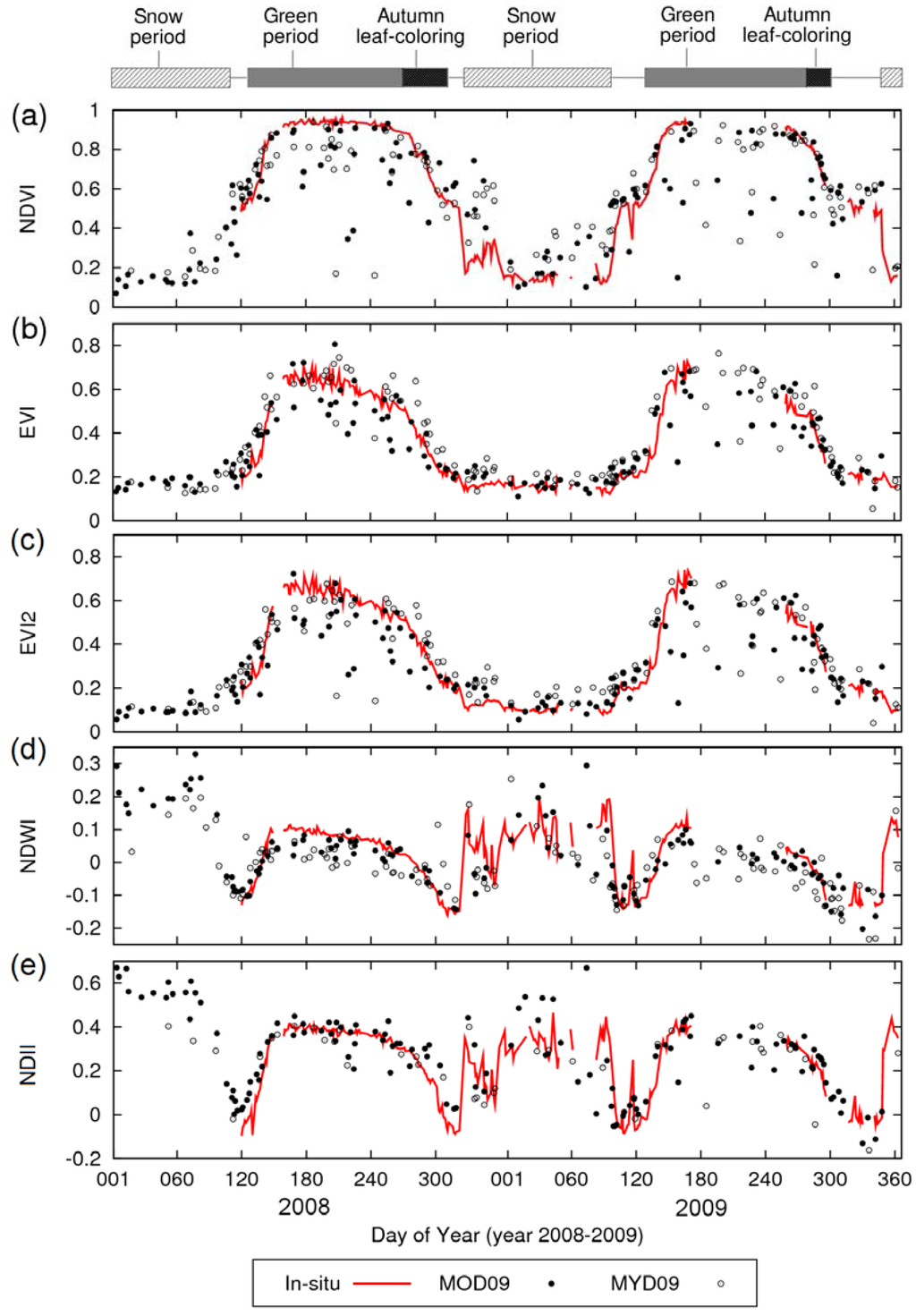 The MODIS indices were systematically slightly higher than the in situ indices at the start and end of the growing season. This may be due to the difference in tree phenology between the MODIS pixel area and the in situ observed area. Although we had already checked the land-cover homogeneity in a MODIS pixel when referring to a high-resolution image, the timing for spring leaf green-up and autumn leaf senescence for individual trees can differ some extent [], which can affect the timing of the spring increase and autumn decrease of spectral indices. In other seasons, the seasonal changes in MODIS reflectances and spectral indices agreed closely with the in situ indices. This result suggests that MODIS radiometric correction is effective in at least this area.