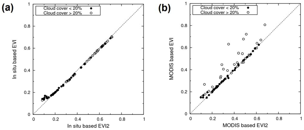 Scatter plots between EVI2 and EVI: (a) in situ data and (b) Terra MODIS data.