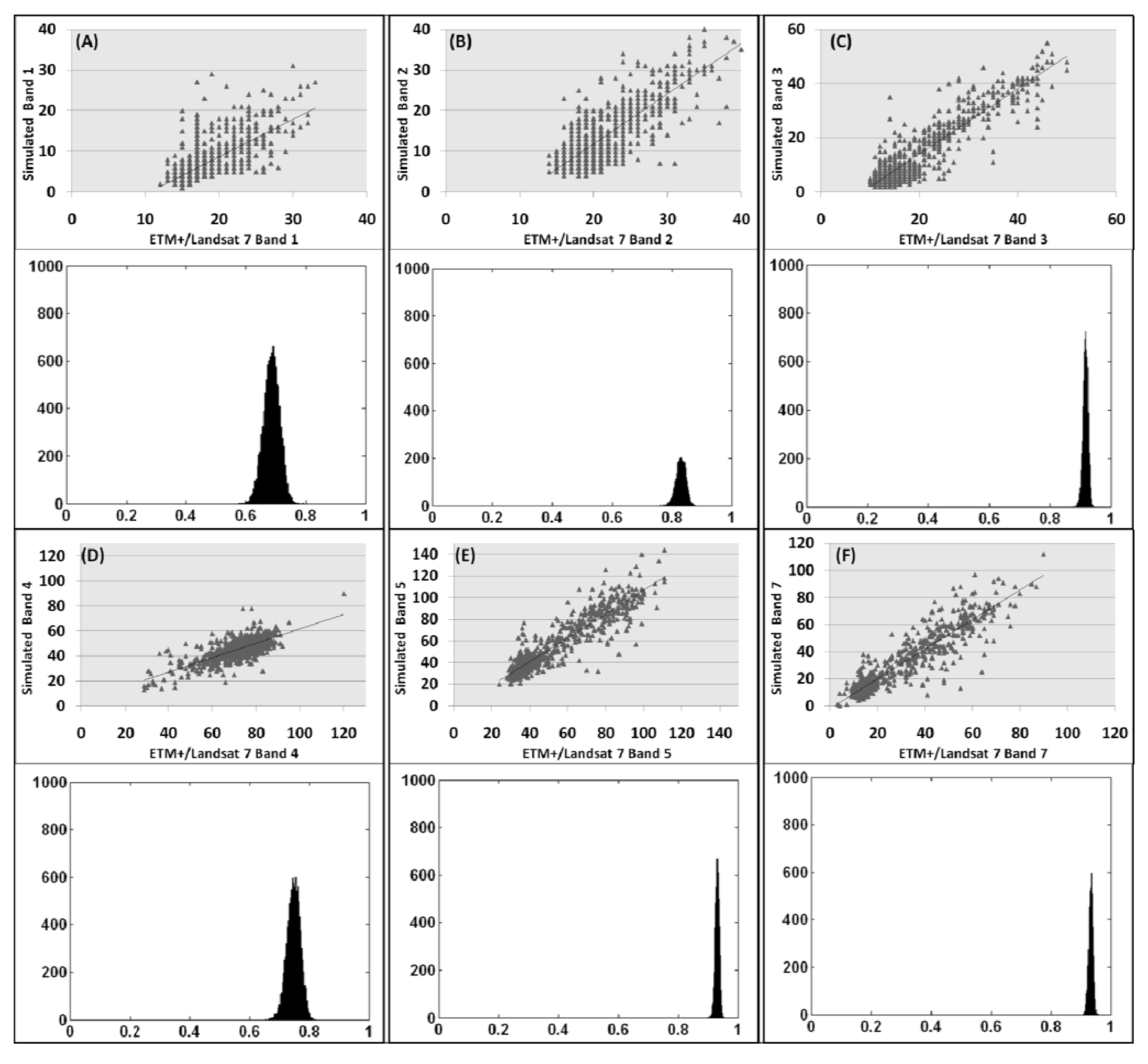 | ETM+/L7 Band | ETM+/L7 bandwidth (nm) | MODIS/Terra Band | MODIS/Terra bandwidth (nm) | ETM+/L7 spatial resolution (m) | MODIS/Terra spatial resolution (m) |