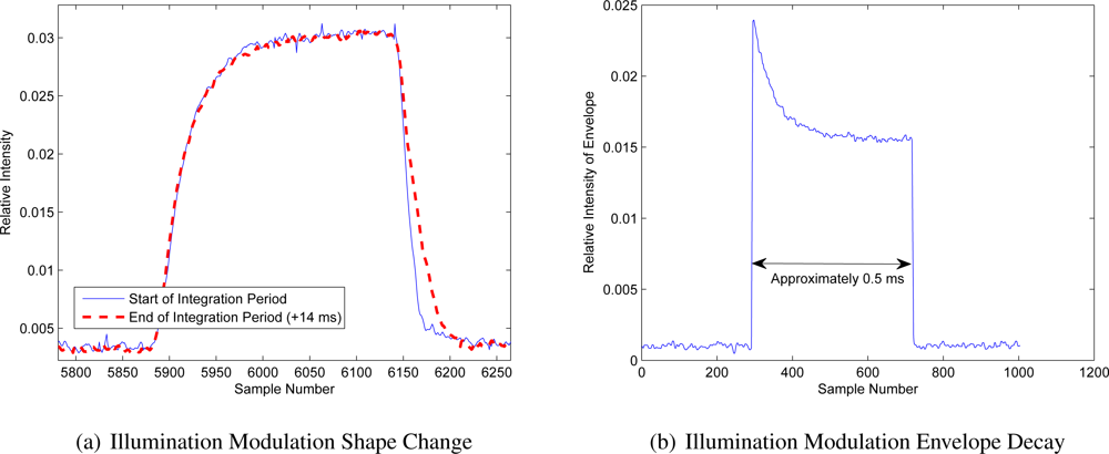 Figure 3(a) presents a comparison between the illumination waveform shape at the beginning and end of a 14 millisecond integration period for the SR-4000. By the end of the integration period, the waveform has increased in width. A similar plot of the envelope of the illumination for a much shorter integration period is given in