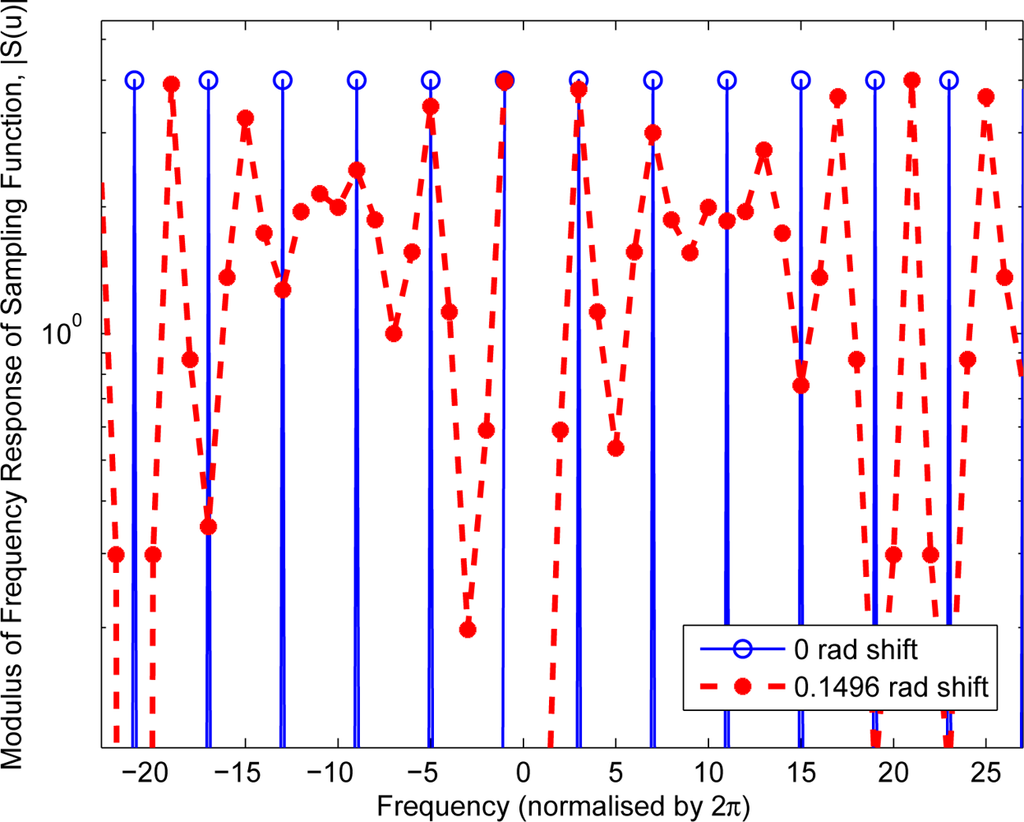 Equation (16) implies that any spatial frequencies that exist in both the reference waveform and the sampling function result in errors in the recorded complex domain measurement. From the Nyquist theorem, frequencies satisfying