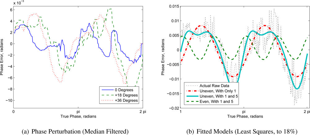 Figure 5(b) shows the results of fitting different models to one of the linearity plots. Assuming even phase sampling and the presence of a fundamental and fifth harmonic, it is impossible to adequately fit the error shape. Using