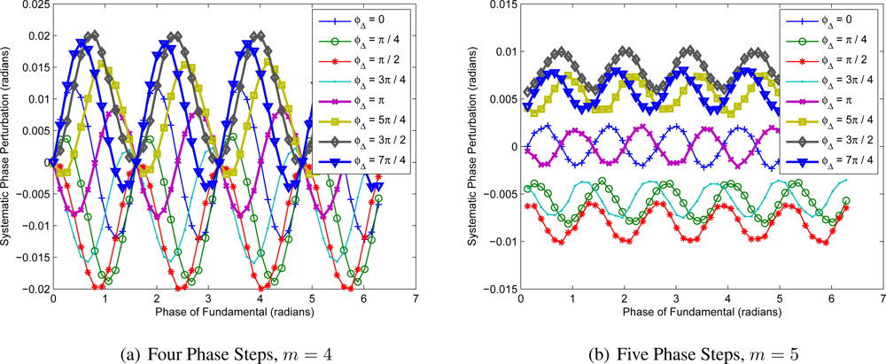 Equation (21) and assuming that the modulation waveforms were pure sinusoids produced a two cycle error which roughly fit the data. Applying the same model by assuming the presence of both a fundamental and fifth harmonic resulted in a near perfect fit. Admittedly, this is based on an extremely naïve model, but attempting to fit a strictly correct model would have too many parameters and overfit the waveform. However, it does demonstrate that irregular phase steps are a plausible mechanism for generating phase and amplitude errors that are not multiples of the number of phase steps.