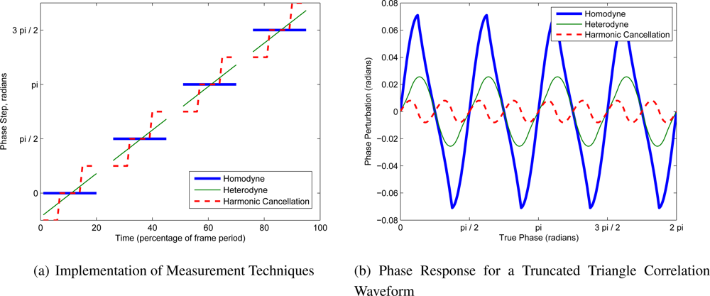 One of the major constraining factors for real-time operation of an AMCW system is read-out time; as the number of explicit phase steps increases, the overall range measurement frame-rate decreases. An alternative approach is to retain four separate measurements, but integrate over more than one phase step in order to deliberately cancel out the aliasing harmonics. While a true heterodyne approach requires specialised hardware, it is possible to achieve a similar outcome using discrete homodyne phase steps. Payne