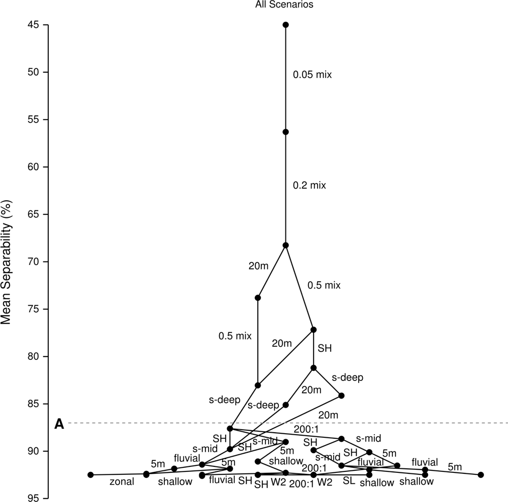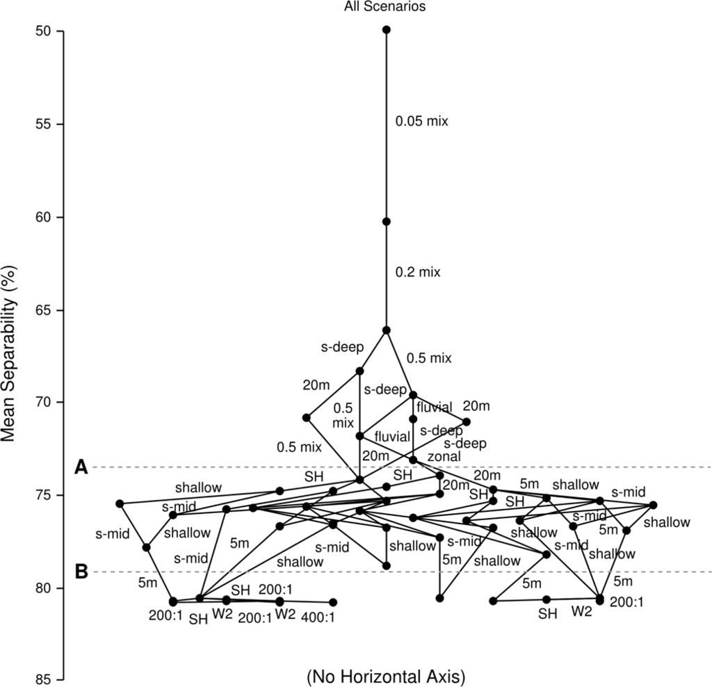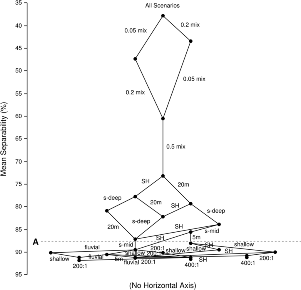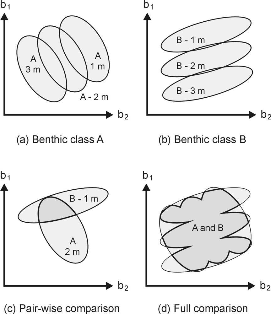 | Shallow (0.5–2 m) | Three image-variable classes each of which models a remotely sensed image in which variation in depth is present. Shallow contains the two depths 0.5 m, 2 m; Shallow-Mid contains, 0.5 m, 2 m and 5 m; | |