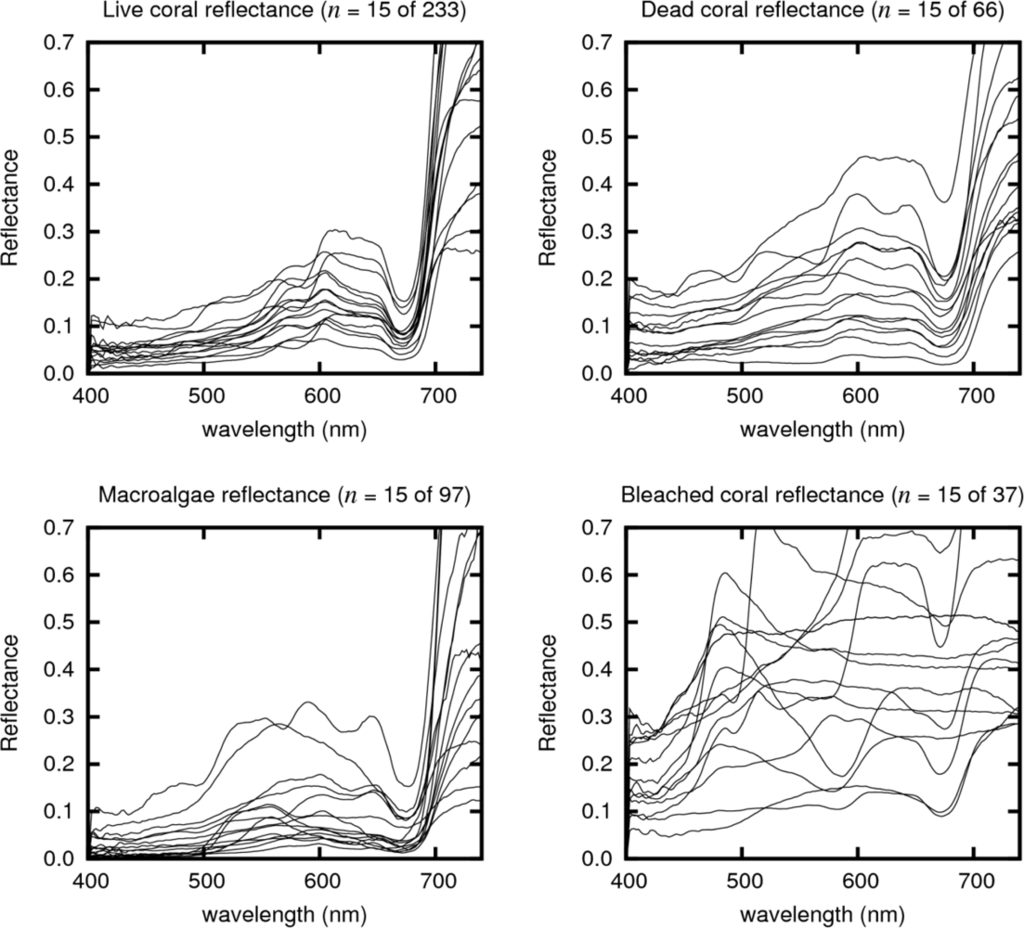 | Live Coral 100% cover | Each class is represented by 200 randomly generated diffuse spectral reflectance profiles constructed as a proportional linear mix between two random in situ reflectance spectra drawn from the field collected spectral library (Table 3, Figure 4). Linear spectral mixing at the bottom of the water column was therefore assumed [24]. The figure of 200 spectra per class was determined experimentally to ensure the variation in the in situ libraries was fully exploited while, for computational efficiency, excessive numbers of spectra were not propagated through the model (see Results and Discussion. | |