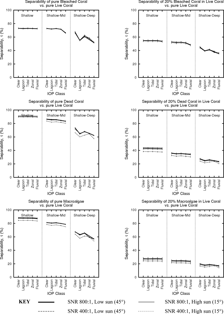 | Benthic Type vs. Pure Live Coral. | Mixture Proportion | Solar Zenith | Wind Speed | Depth Class | n | % of Sensor Limited Scenarios (Δτ̄ > 5%) | |
