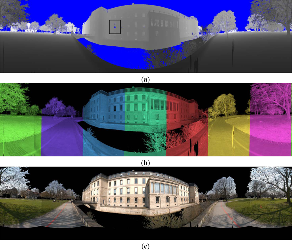 The camera-to-scanner linkage enables rendering the color content on the 3D laser points. Relating each 3D point to the best of the n images is implemented by projecting the point to all images and selecting the one where the projected 3D point’s position is the closest to its perspective center (Figure 1(b)). It is noted that within the point’s projection computation, points that appear at the back of the camera are avoided. The image projection into 3D space leads to some content loss due to change in resolution, but allows for processing of both information sources in a single reference frame (Figure 1(c)).