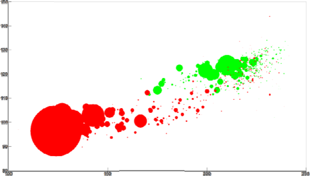 Distribution of the segment-averaged range-cornerness and intensity-cornerness values. Green/red, tree/non-tree related segments, respectively, according to the ground-truth. The circle size is proportional to the segment size.