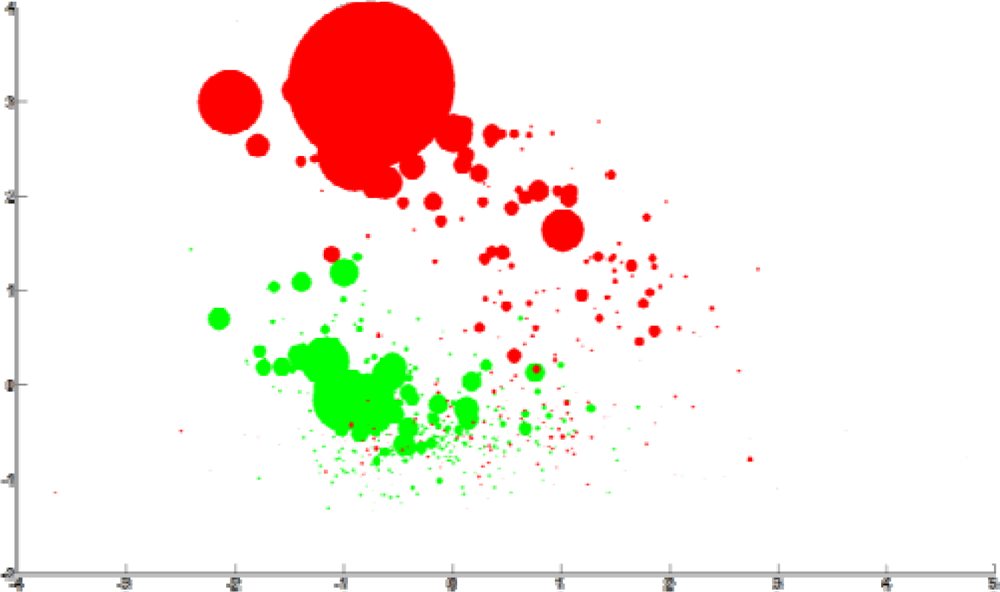 Distribution of the segment-averaged range-cornerness and intensity-cornerness values following the whitening transform. Green/red, tree/non-tree related segments, respectively, according to the ground-truth. The circle size is proportional to the segment size.