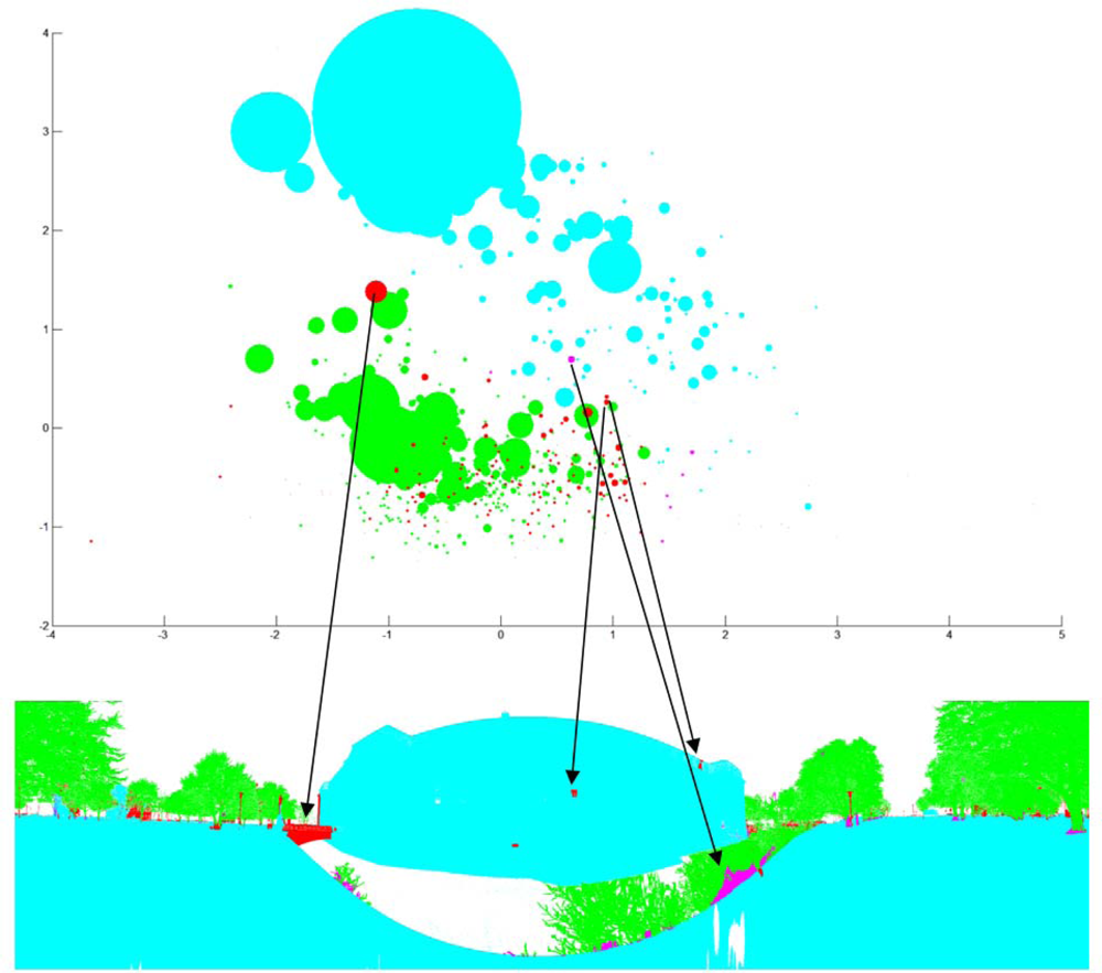 Next, the ability of the cues to separate tree segments (in contrast to pixels as in Figures 4–14) is studied. First, the detection power of the range and intensity cornerness measured is tested as they showed the highest distinguishing power both as an individual cues and as a combined cue in pixel-level examinations. For each segment the value of each of cues was averaged, creating a 2D feature vector. A scatter plot of the 2D feature space (the average range’s and intensity’s cornerness values per segment) is presented in Figure 15 (using scan 23—Figure 1(a)). For better visual emphasis, circle size is plotted in Figure 15 as a function of the segment size. Notice that the distribution along the two axes is not equal and that there is a correlation between the two cues. Following the whitening transform (Equation (4)) the two dimensions are equally scaled and become uncorrelated (Figure 16).