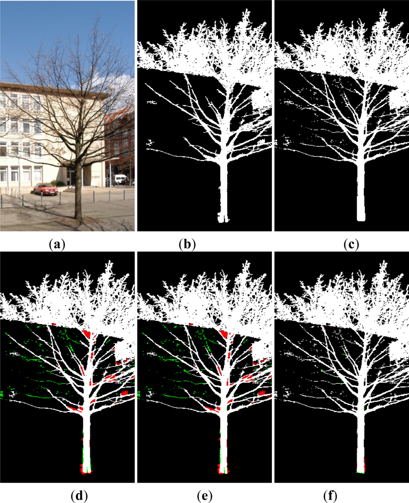 Demonstration of the graph-cut application: (a) Image of the studied tree. (b) The classified tree segment before applying the graph-cut refinement phase. (c) The classified tree segment following the graph-cut application. (d) Differences following the application of the refinement phase: in green added points, in red deleted points. (e) Difference between the ground truth and the classified tree segment, before the graph-cut application: in red type-I error (false alarm) and in green type-II error (miss). (f) Difference between the ground truth and the classified tree segment, following the graph-cut application: in red type-I error (false alarm) and in green type-II error (miss).