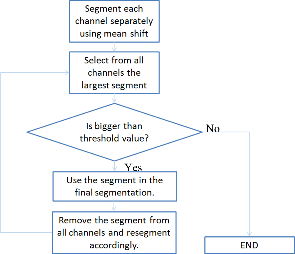 The proposed model is applied as follows: first, the largest segment is selected from all channels; if the segment quality is satisfactory, it is inserted into the integrated segmentation. All pixels relating to this segment are then subtracted from all the channels and isolated regions in the other channels are then regrouped and their attribute value is computed. Following, is the extraction of the next largest segment and the repetition of the process until reaching a segment whose size is smaller than a prescribed value and/or preset number of iterations. Figure 2 presents a flowchart diagram of the process. It is noted that due to the non-parametric nature of the mean-shift segmentation, re-segmenting the data between iterations has little effect. We also note that this segmentation can be further refined [25], but results obtained using this approach are sufficient to the present purpose.