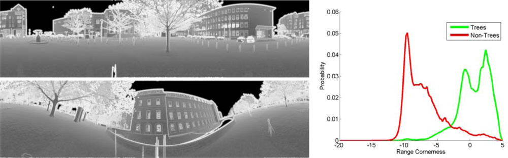 As a first step, the response of the object for different cues derived from the input channels was examined. Beginning with the range channel (Figure 3) the cornerness, sum of derivatives, and sum of the absolute values of the derivatives were tested (Figures 4–6). For each of the cues, the distributions related to “tree” and “non-tree” classes are presented. These are made in reference to manually extracted trees as ground truth. The distributions show that among the three, the one with the strongest distinction power is the cornerness.