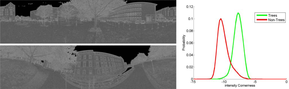 For the intensity channel, the two cues tested were the intensity values and cornerness (Figures 7 and 8). Between the two, the cornerness has the more pronounced separation, relative to the intensity cue where tree and non-tree classes are mixed.