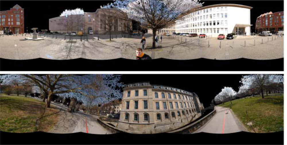 The proposed approach was tested on two sets, one containing 16 scans and the other eight. The scans were acquired by the Riegl LMS Z360i laser scanner (angular resolution of Δθ = Δφ = 0.12°) generating 2.25 million ranges (creating a 750 × 3,000 pixels image), spanning 360° horizontally and 90° vertically with maximum ranges on order of 80 m. Seven, six-mega-pixel size images were acquired per scan using a Nikon-D100 camera with a 14 mm lens, and were processed in full resolution. Overlap between images was ∼13.5%, equivalent to ∼270 pixels. The first set covers a courtyard-like square and offers a typical urban environment that is dominated by manmade objects. The second set covers mainly an open park area, bordered by a castle façade, with trees and vegetation in a variety of forms and at different distances from the scanner (Figure 3). Both sets feature a significant amount of occlusions and clutter, featuring, cars, buildings, and other complex objects, in addition to trees.