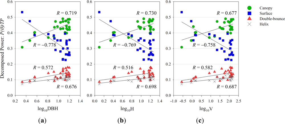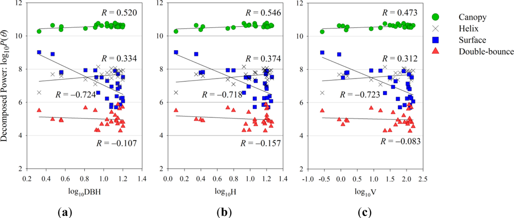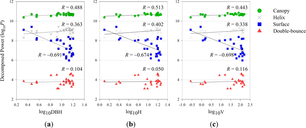 The decomposition powers were separately extracted from and averaged over each of the forest stands containing a PSP for the comparison to the ground-based observation data of the forest parameters. Details of the field-measured data used in this study were given in [19]. The correlation analysis was performed between the base 10 logarithms of the forest stand parameters, namely, log10DBH (Figure 5(a)), log10H (Figure 5(b)) and log10V (Figure 5(c)) on the x-axis and the base 10 logarithms of each of the decomposition powers (log10P) on the y-axis.