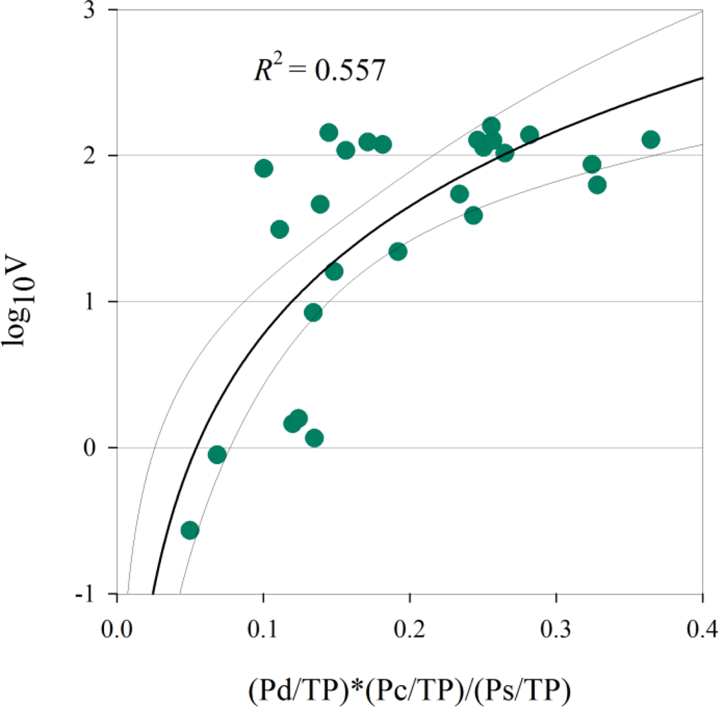 Scatterplot and logarithmic regression (thick line) of the parameters with the decomposition powers divided by the total power (P(θ)/TP) on the x-axis and the base 10 logarithm of the stand volume (log10V) on the y-axis. The 95% confidence band is shown by thin lines.